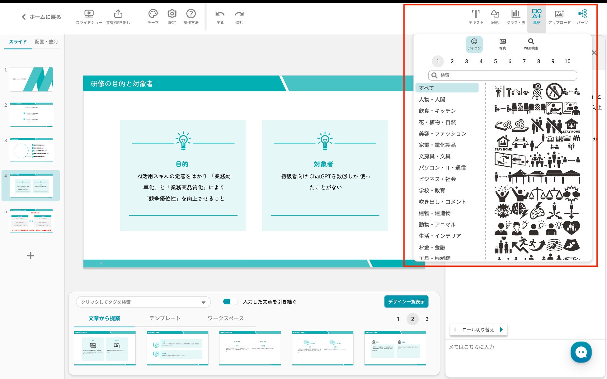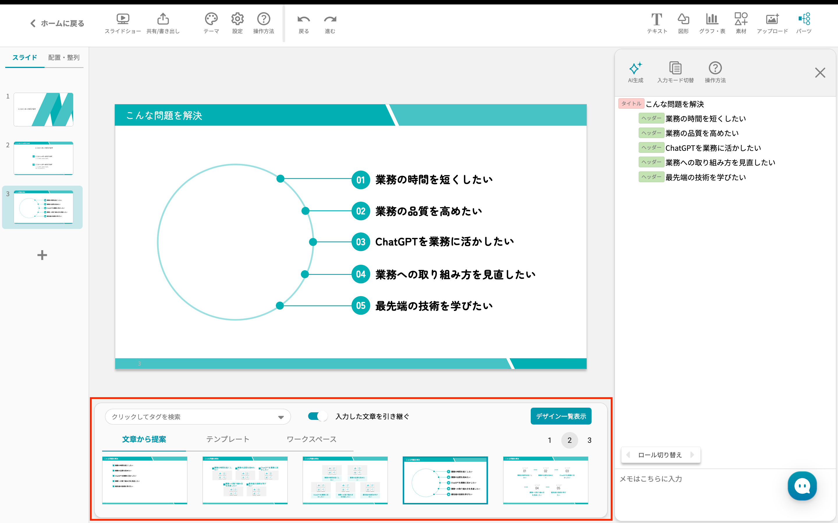 ※スライドのデザインはAIが提案します。デザインパターンが1,000種類以上あり、好きなデザインパターンを選べるので、赤枠内に表示されるスライドのイメージに合わせてご選択ください。