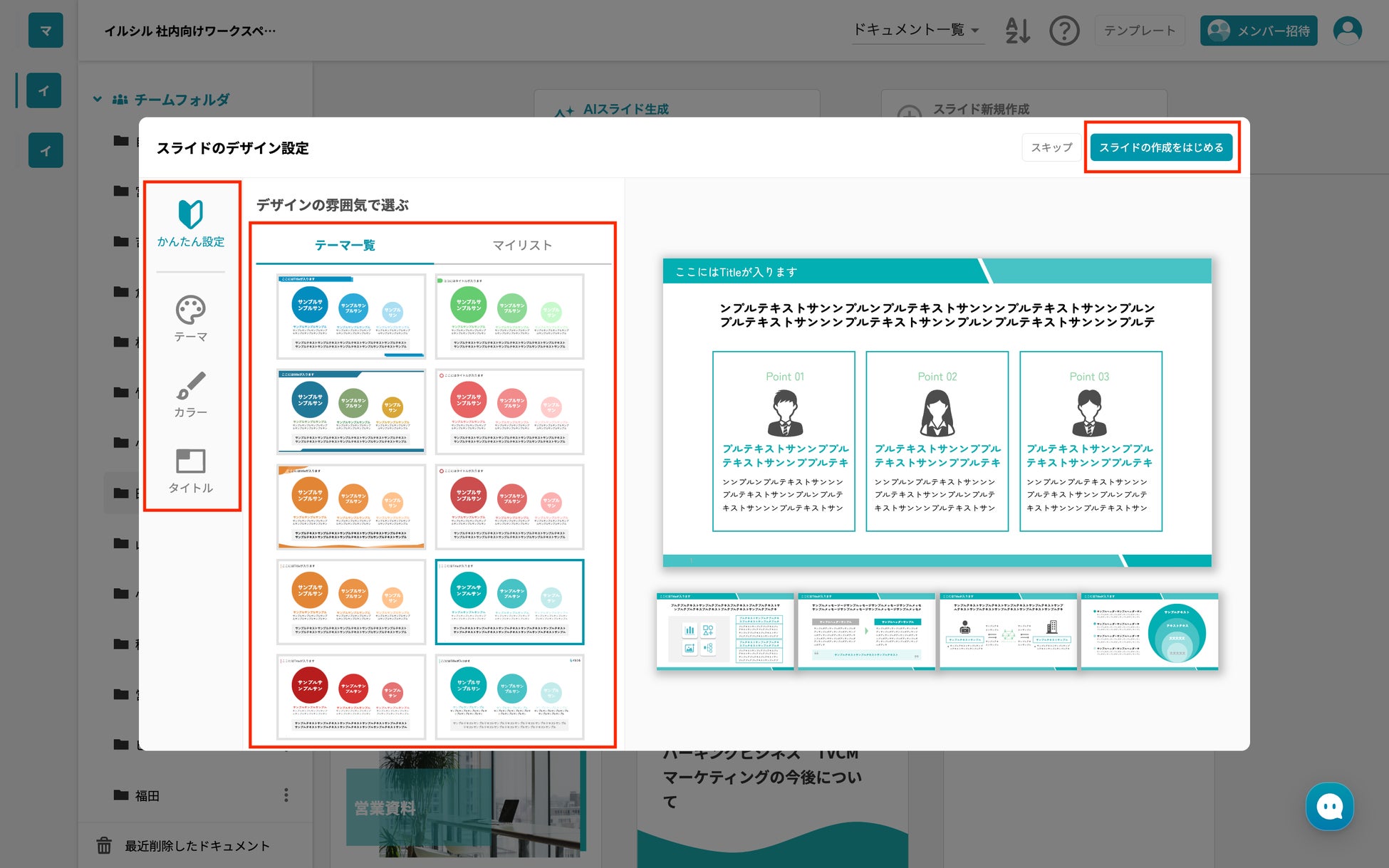 1.ログイン後、「スライド新規作成」機能をクリックし、デザインテーマやカラー、タイトルデザインなどを選択、「スライドの作成をはじめる」をクリック。