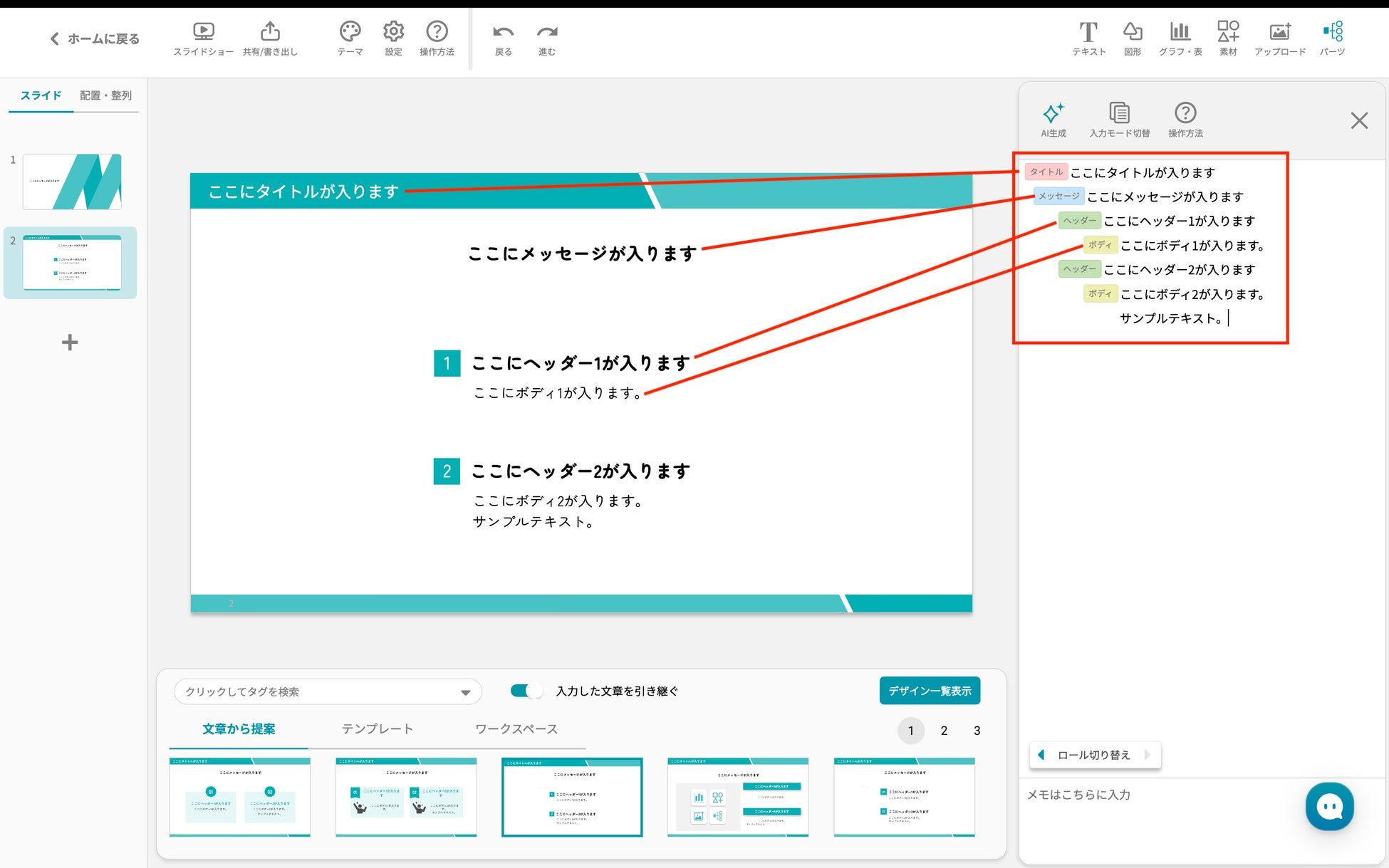 テキストごとに割り振られたロール(役割)を組み合わせてスライドの作成を行います。