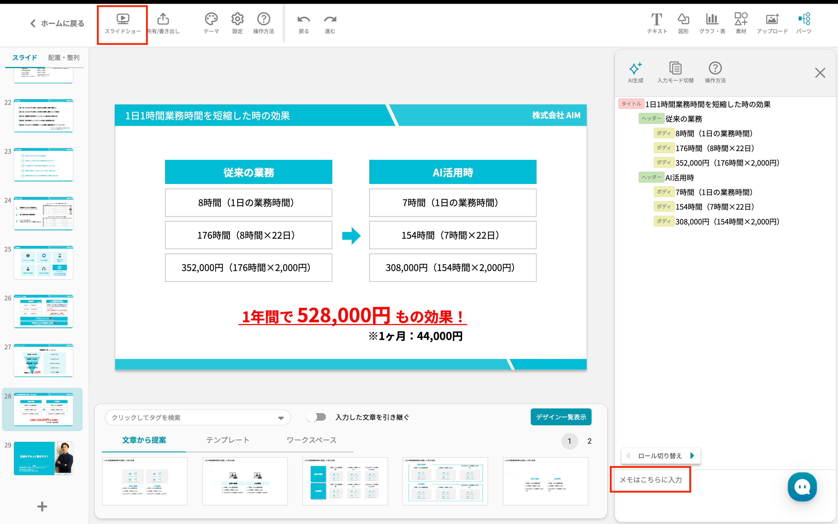 作成した資料は、作業画面上部の「スライドショー」ボタンを押すことで、そのままプレゼン資料として利用することが可能です。発表者モードを選択すれば、テキストボックスの「メモはこちらに入力」の箇所に入力した内容を、発表時のメモとして自分だけが確認することができます。