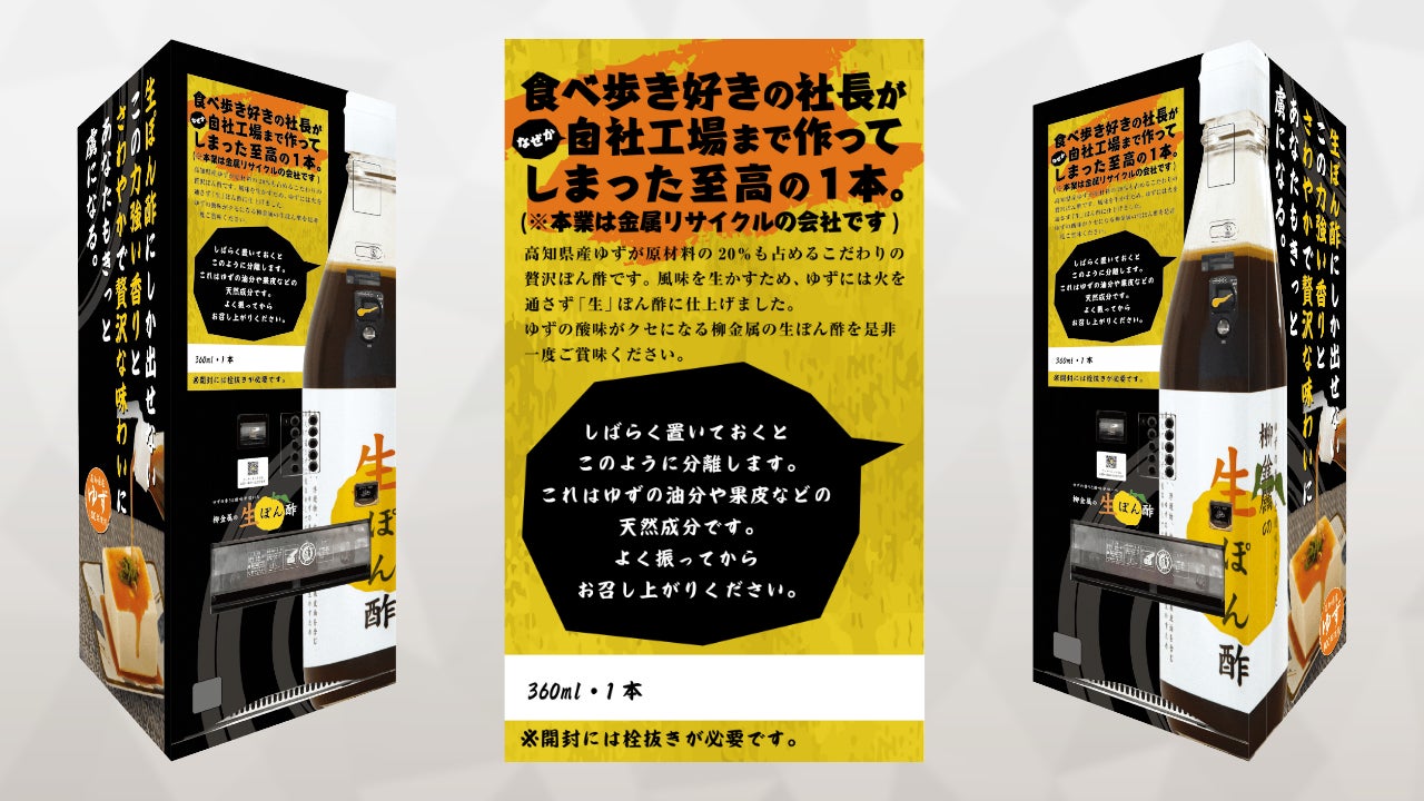 自販機は、柳金属産業株式会社様の①本社前と②伊丹スカイパーク近くのYMIパーキングに設置されています。自販機で販売される至高のポン酢は、高知県産の柚子が原材料のなんと20%も含まれた、贅沢な味わいが自慢です。柚子は火を通さずに「生」のまま使用し、他にも厳選した素材を使用しています。