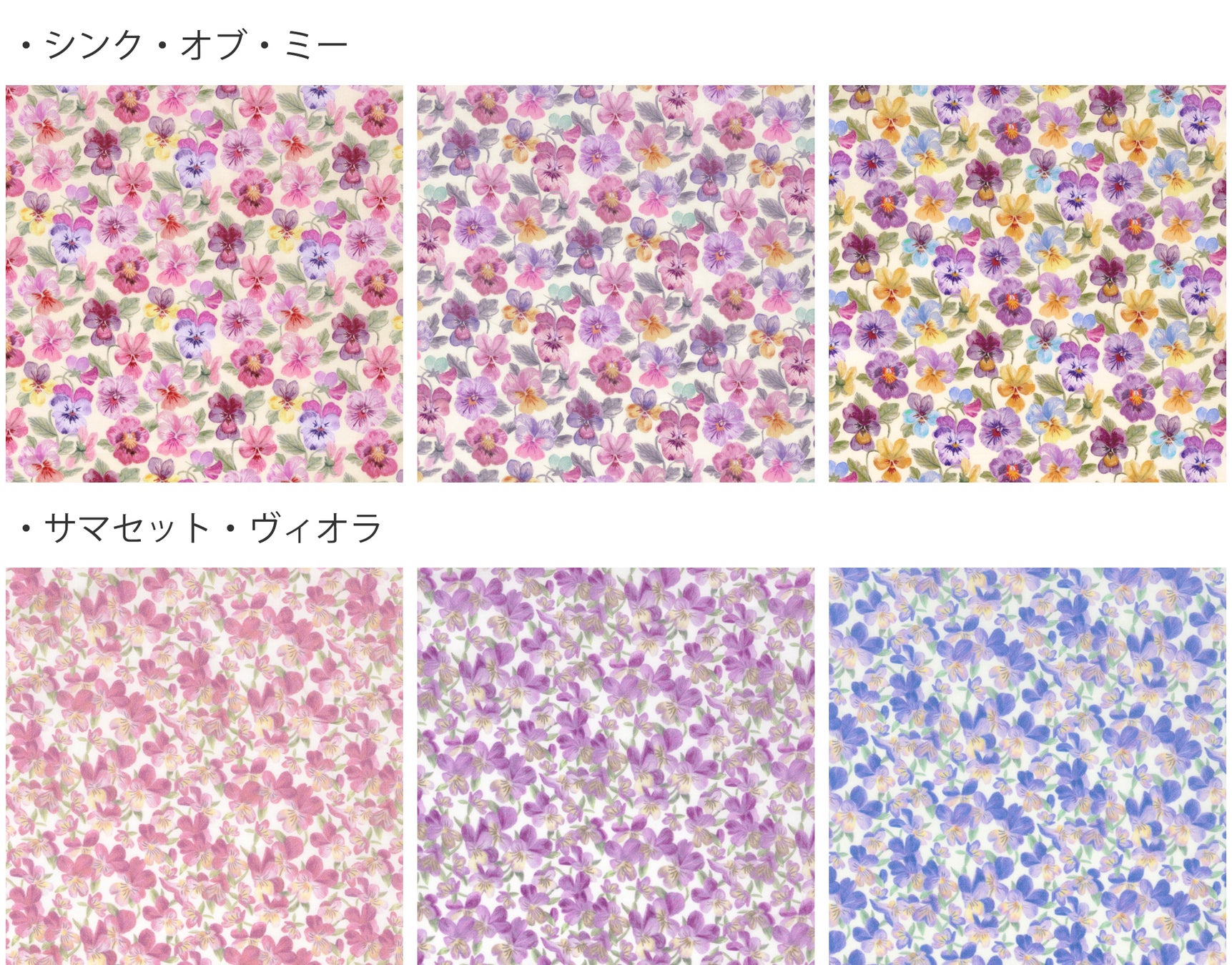 つるばらやパンジーなど、春の花々をイメージした柄の他、通園通学用小物の制作にもおすすめの柄など4柄12種。