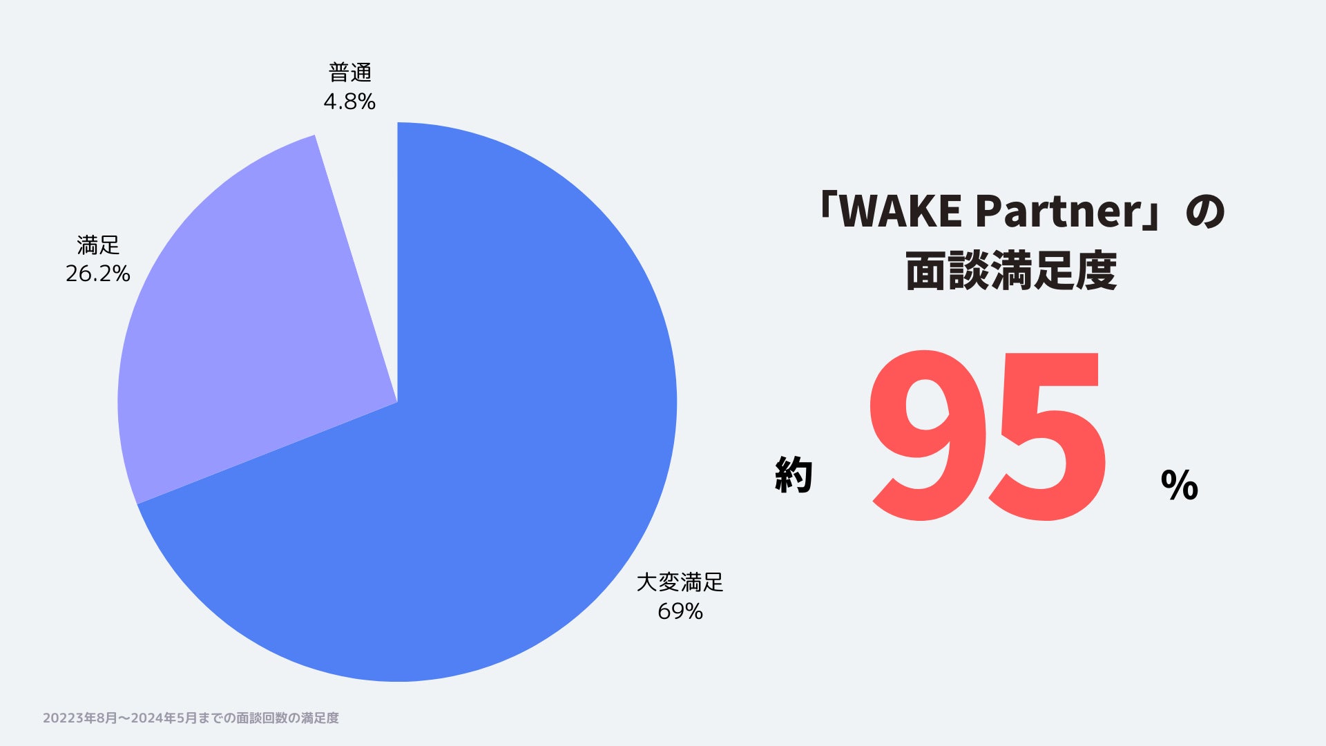 「WAKE Career」のキャリアサポート面談の満足度は約95%となりました。去年の8月からスタートした「WAKE Partner」の面談は70回以上を超えています。