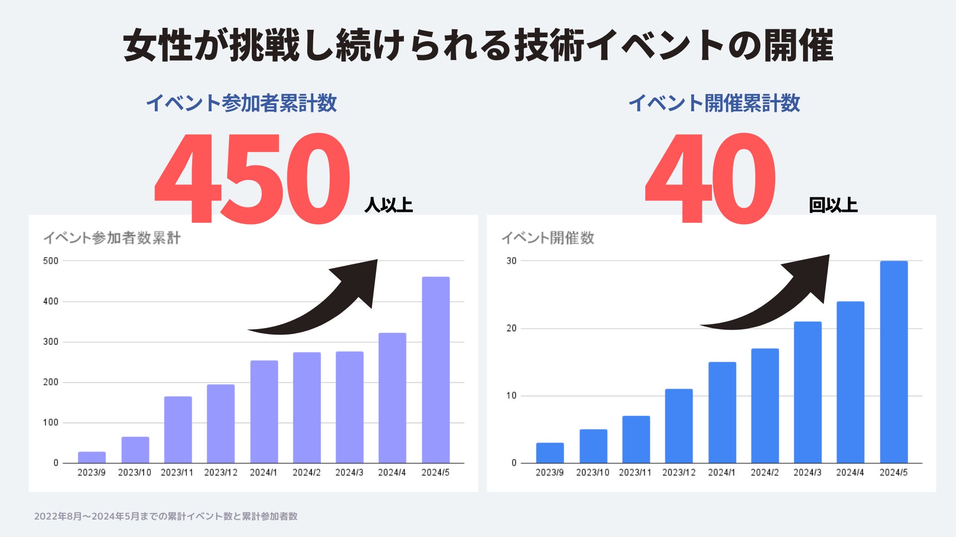 「WAKE Career」は転職サービスのみならず、ハイスキルな女性エンジニアが集まり、挑戦し続けられる技術コミュニティ、プラットフォームを目指しています。8ヶ月でイベント開催回数は40回以上、参加者は450人を超えてきました。今後も積極的にエンパワメントでもあり、スキルアップもできるイベントを開催していきます。