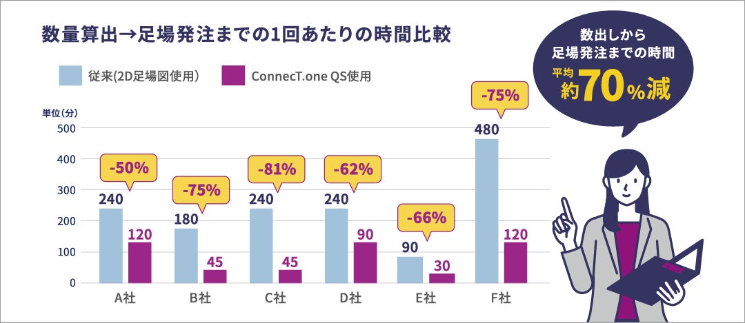 応用技術が提供する、仮設部材の数量算出を行えるNon-BIMユーザー向けのクラウドサービス「ConnecT.one QS」の導入により、お客様自身で必要な部材を自動で算出が可能になりました。これにより、数量算出から足場発注までの時間を平均して70%削減、また「ConnecT.one QS」で足場の数量算出状況を確認し現場で共有することで、足場組立の段取りが容易になり現場でのBIM活用が進みました。