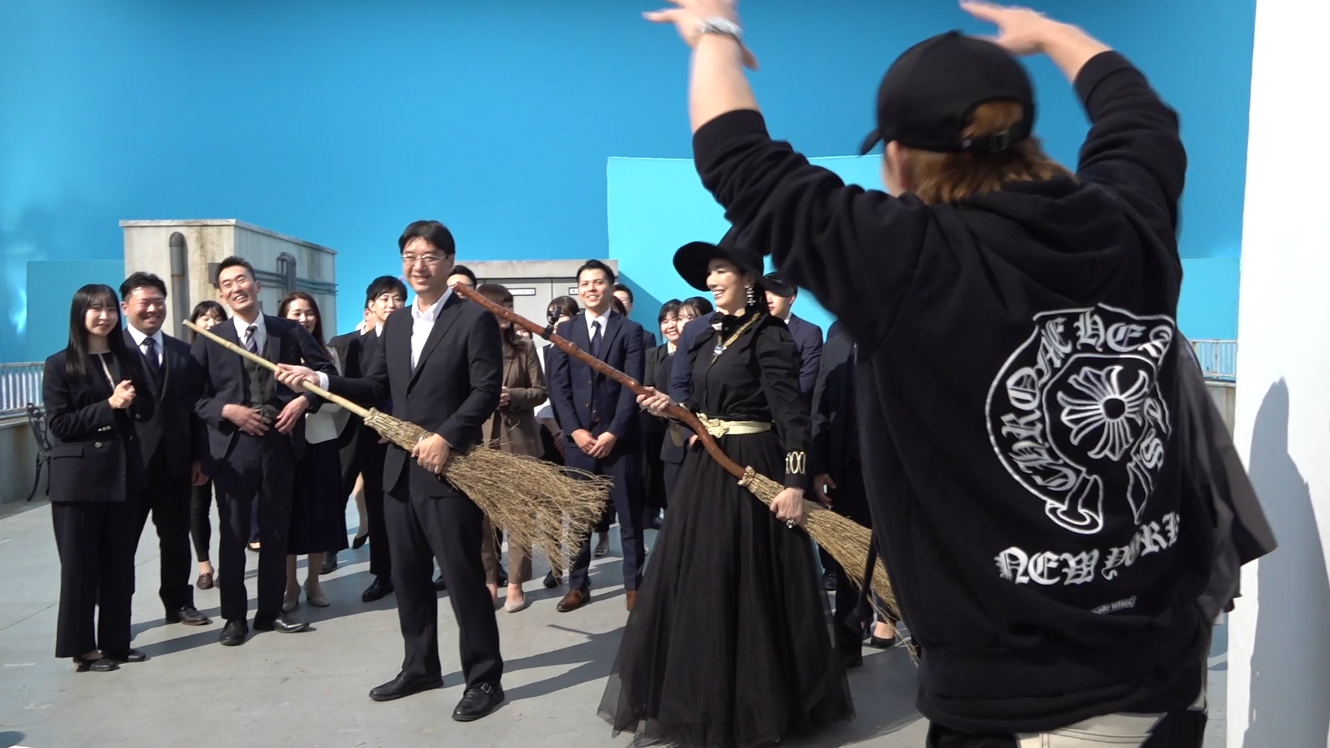 さらにほうきをギターに見立てて踊るシーンでは、KENZOさんが「ダンスバトルだと思って、みんな盛り上がっちゃってください!」と声をかけ、現場のテンションも最高潮に。社員の皆さんも全力でダンスを楽しみ、盛り上がりながら撮影は終始和やかな雰囲気で進行しました。撮影終了後、アン ミカさんはKENZOさんとハイタッチを交わし、社員の皆さんに「皆さんすごーい!」と称賛の言葉を贈りました。撮影が全て終了し、アン ミカさんは、笑顔で花束を受け取り、現場を後にしました。