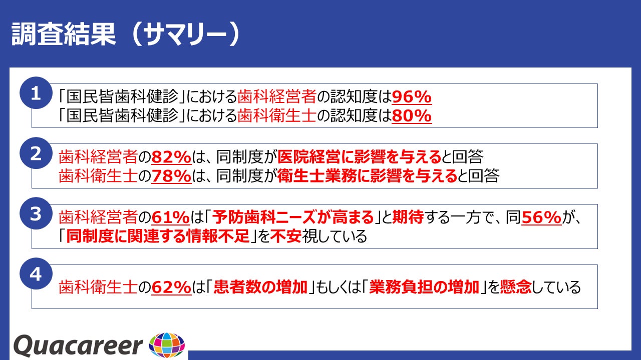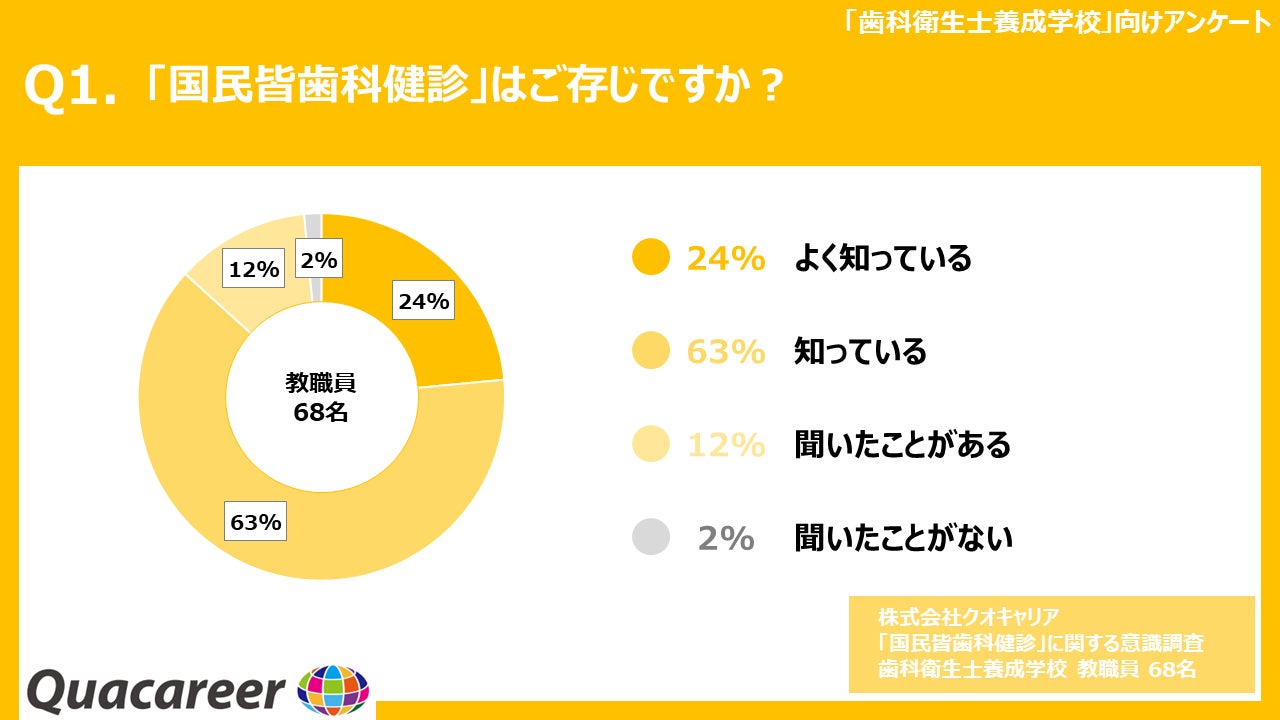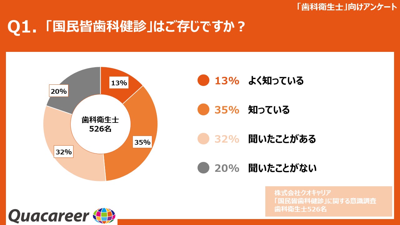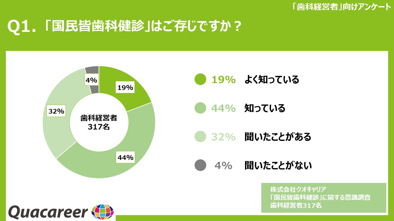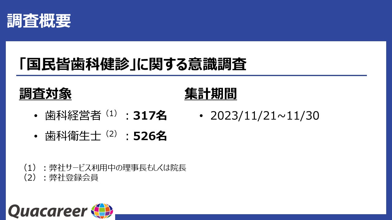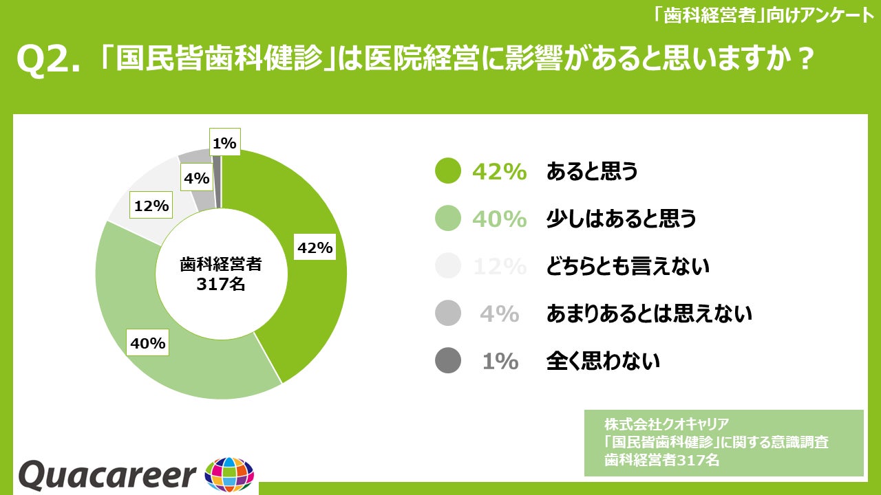 2006年より歯科衛生士・歯科医師向けの求人メディア『クオキャリア』の運営、及びキャリア・就学支援等を展開している株式会社クオキャリア(代表取締役:中山豊、本社:東京都豊島区、以下「クオキャリア社」)は、近年注目を集めている「国民皆歯科健診」(注)につきまして、歯科経営者(317名)・歯科衛生士(526名)を対象に意識調査を実施致しました。その調査結果を発表致します 。