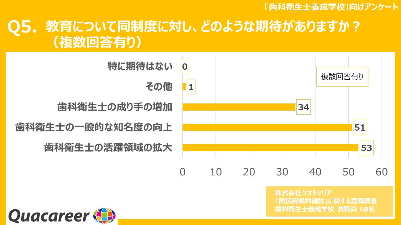 Q5に対する回答は「歯科衛生士の活躍領域の拡大」(53件)、「歯科衛生士の一般的な知名度の向上」(51件)、「歯科衛生士の成り手の増加」(34件)、「その他」(1件)、「特に期待はない」(0件)という結果になりました。
