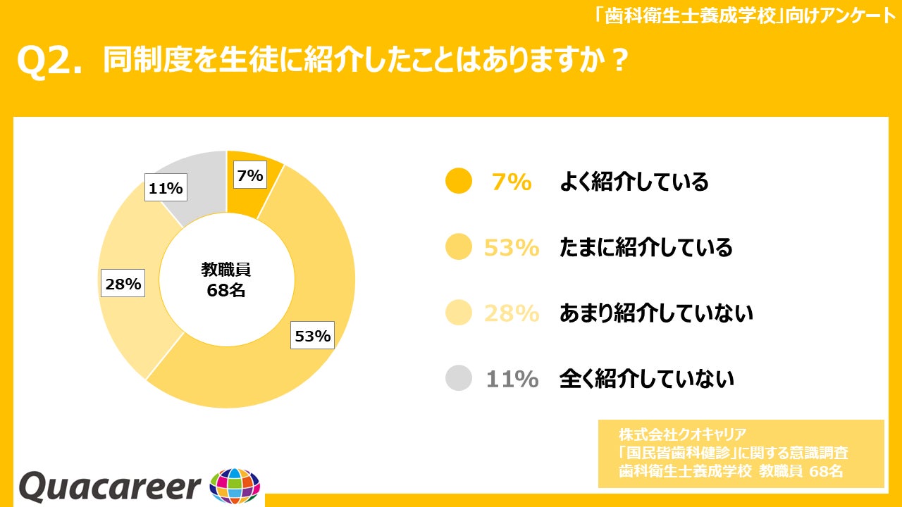 Q2に対する回答は「よく紹介している」(7%)、「たまに紹介している」(53%)、「あまり紹介していない」(28%)、「全く紹介していない」(11%)という結果になりました。