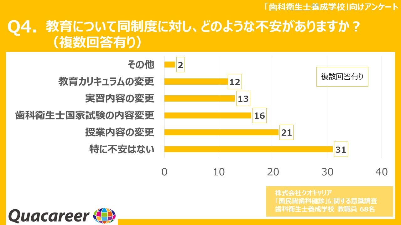 Q4に対する回答は「特に不安はない」(31件)、「授業内容の変更」(21件)、「歯科衛生士国家試験の内容変更」(16件)、「実習内容の変更」(13件)、「教育カリキュラムの変更」(12件)、「その他」(2件)という結果になりました。