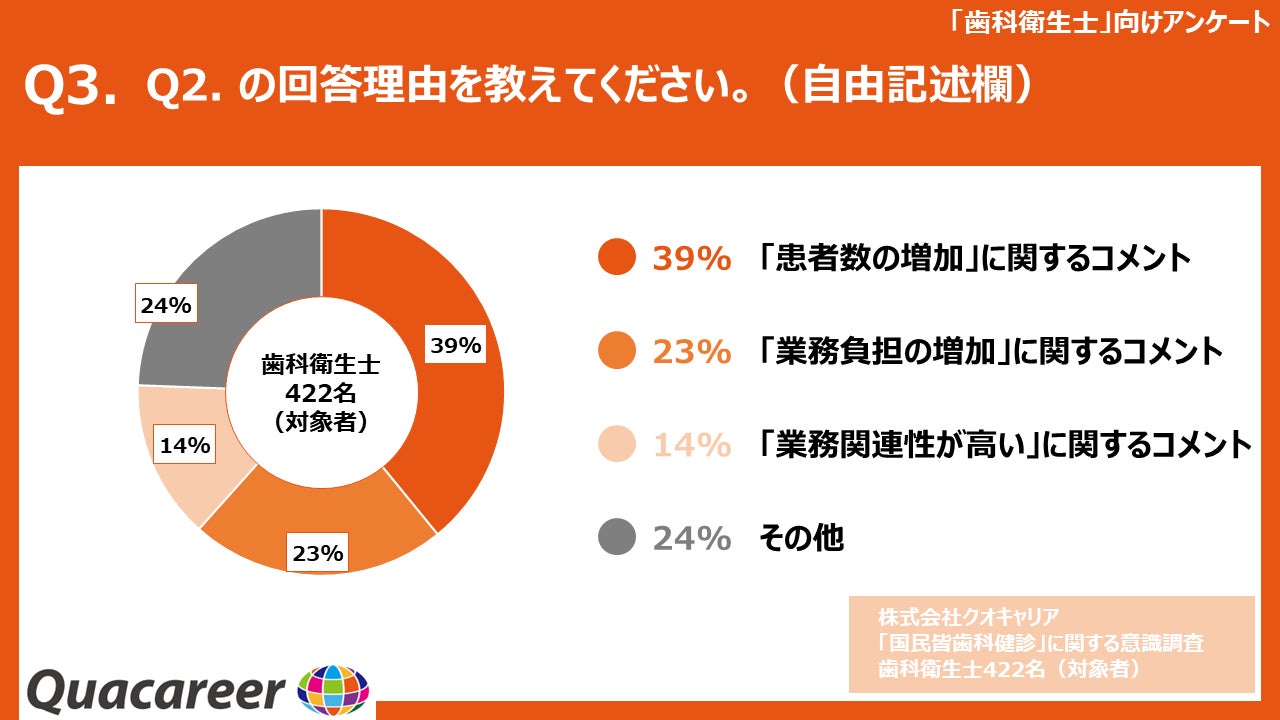 Q3に対する自由記述式の回答の傾向をクオキャリア社にて分析したところ「患者数の増加」に関するコメントが回答者の39%、「業務負担の増加」に関するコメントが回答者の23%、「業務関連性が高い」という趣旨のコメントが回答者の14%という結果になりました。