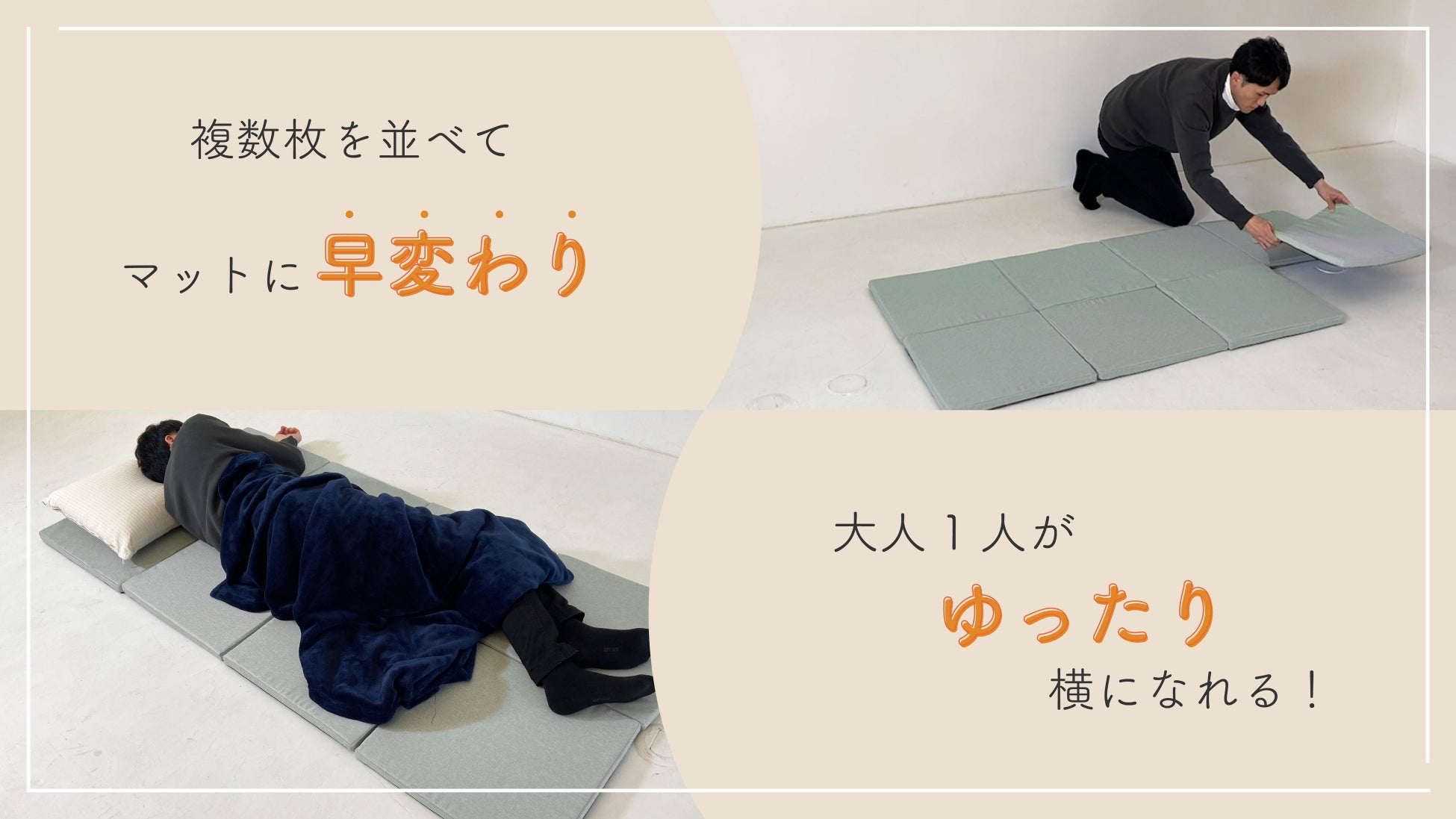 8枚を並べればシングルベッドサイズ(0.9m x 1.8m)で、ゆったり使える