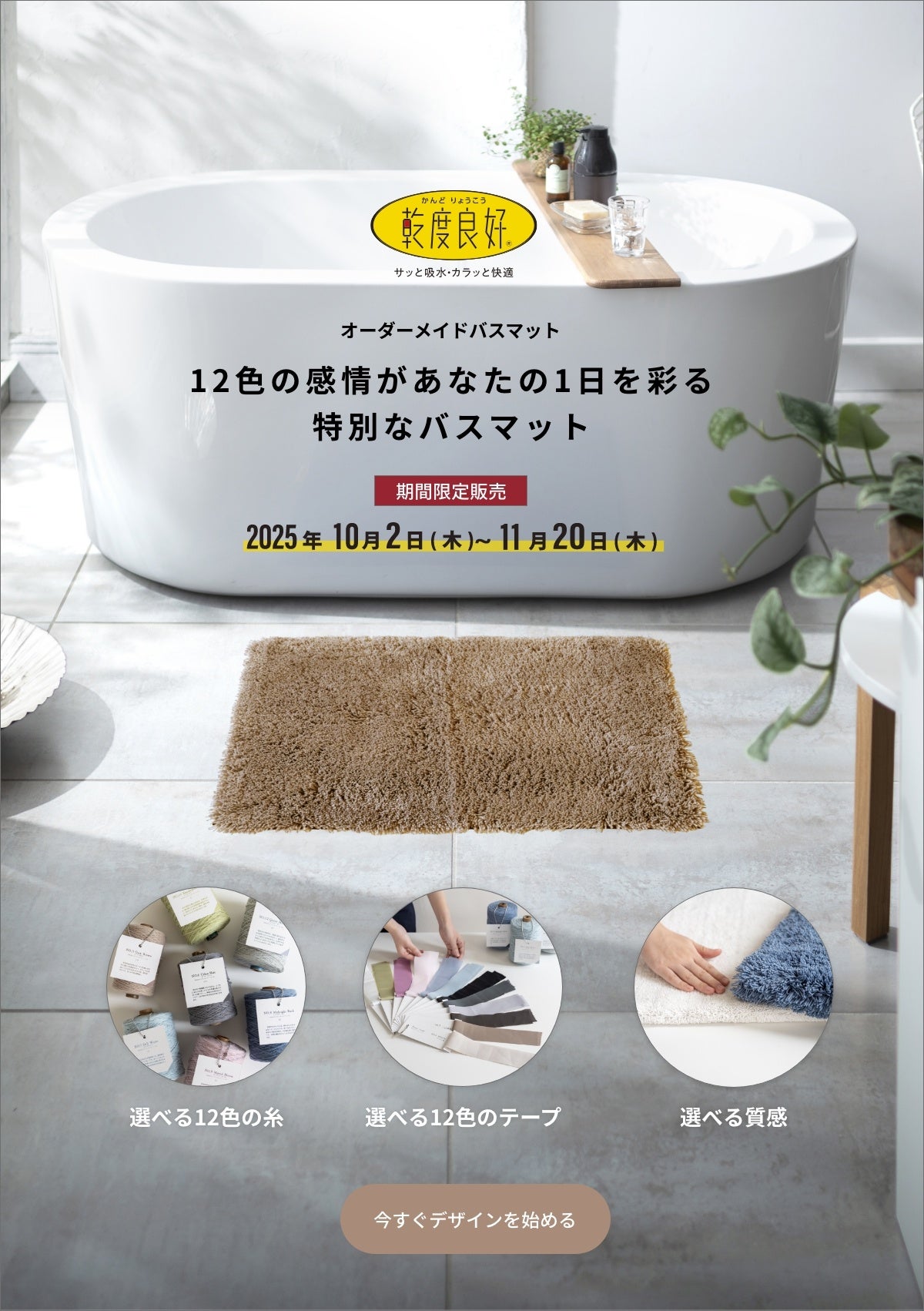 オカ株式会社(本社:和歌山県海南市、代表取締役:岡洋平)の直営店「Mat&Rug Factory(マット&ラグファクトリー)自由が丘店」にてお客様が自由にカスタマイズできる「乾度良好Dナチュレオーダーメイドバスマット」の期間限定販売を行います。2025年11月20日(木)までの受付となります。
