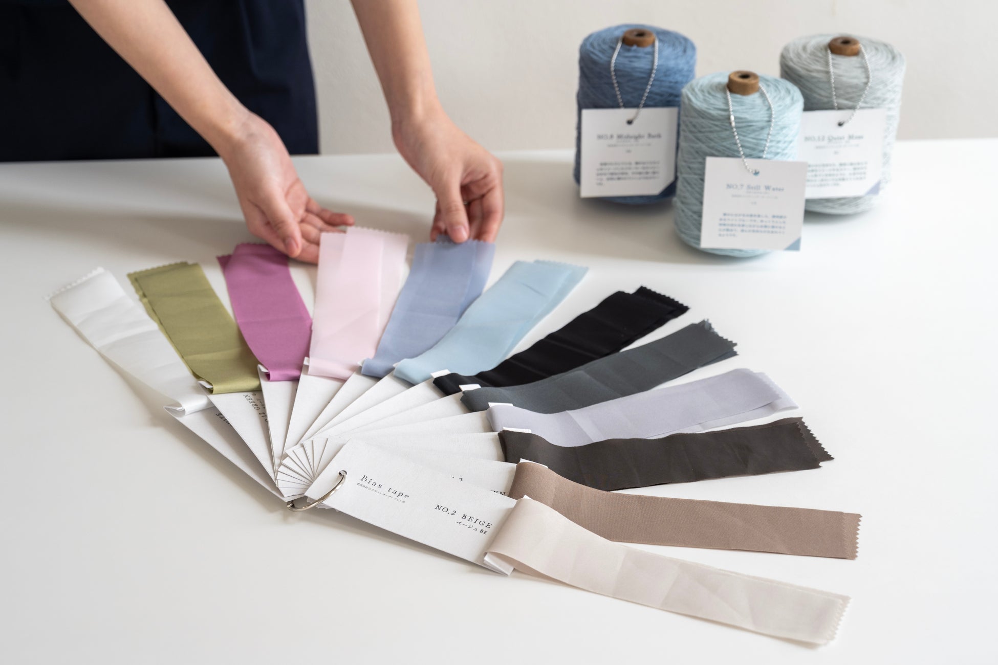 バイアステープも全12色を実物でご覧いただけます。選んだ糸との色の組み合わせをその場で試せるので、より完成イメージが膨らみ、デザインの楽しさが広がります。