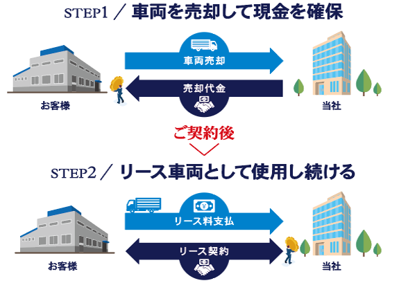 車両リースバックとは、運送会社が所有している車両をリース会社に売却し、再度リース契約を結ぶことによって、引き続き同じ車両を利用することができる仕組みです。所有している車両を売却しリースへ変更することで、「まとまった資金の調達」「キャッシュフローの改善」「車両売却益の計上」「資産のオフバランス化」などが可能になります。また、契約満了時に買戻しと返却の選択もでき、再リースの検討をすることもできます。自社の経営状況に応じて、運送会社にとって重要資産である車両を所有ではなく、リースという方法を検討に入れることで事業継続の選択肢が広がります。