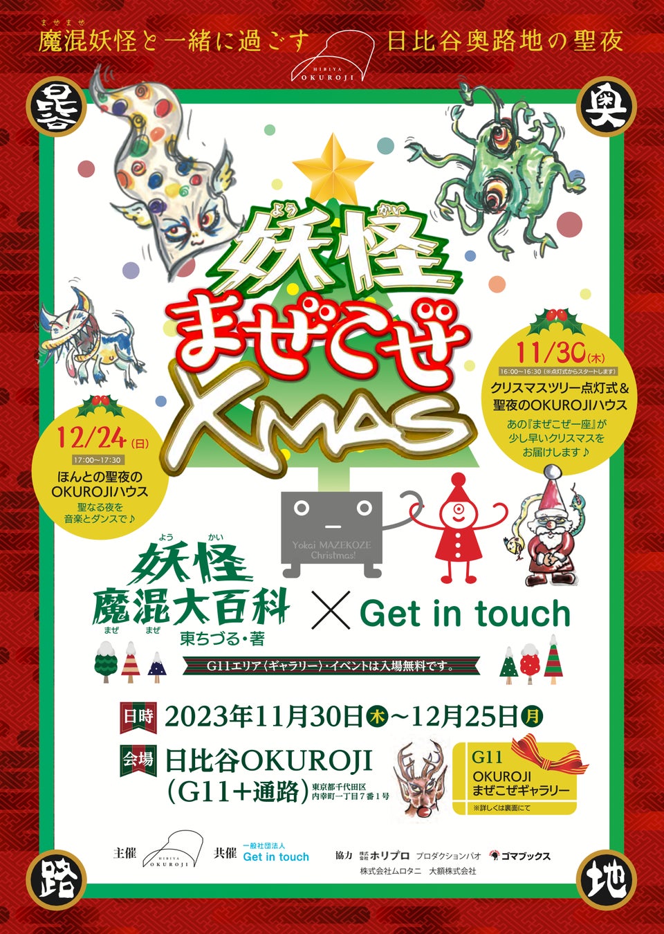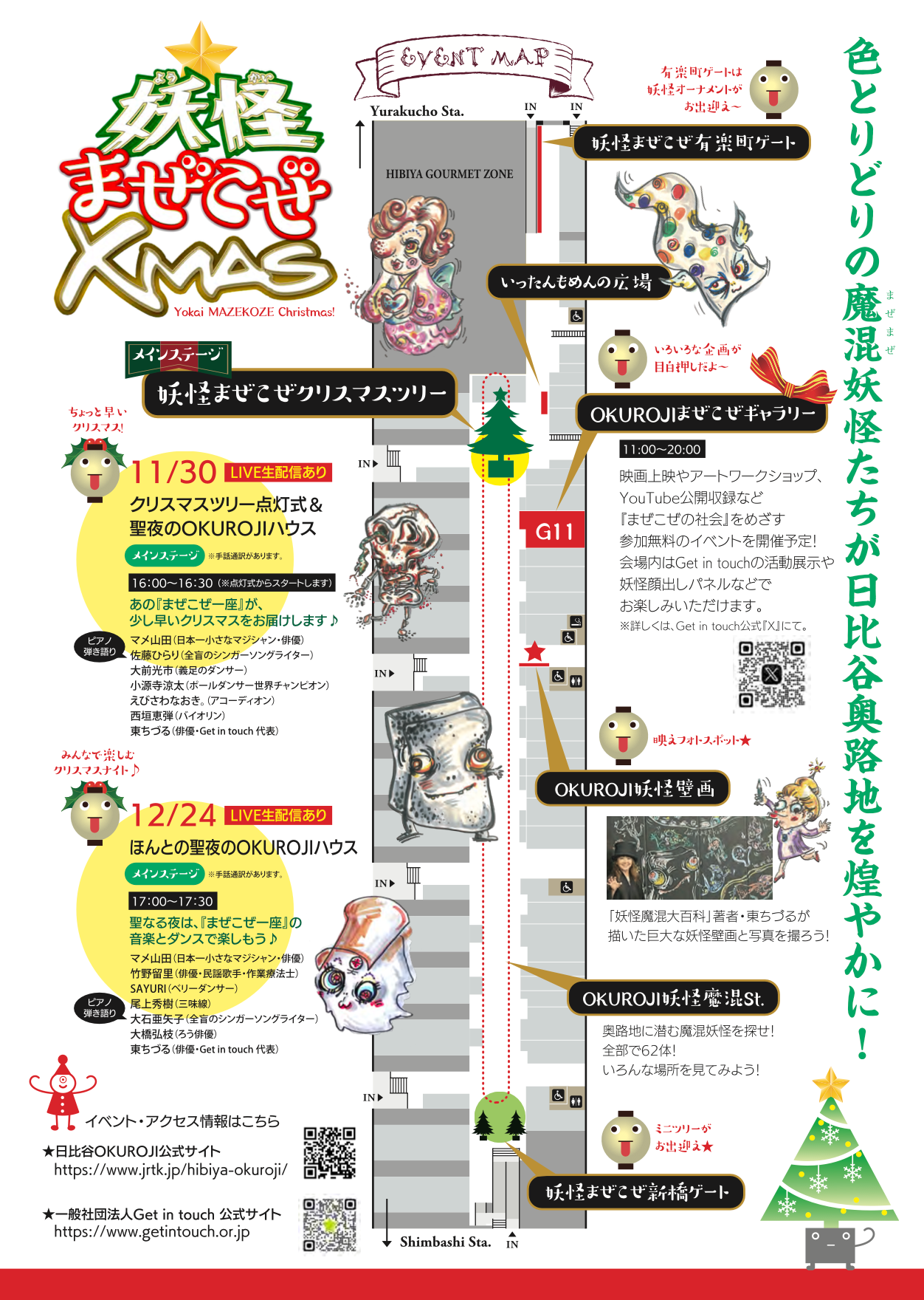 一般社団法人Get in touch(代表:東ちづる)は、㈱ジェイアール東日本都市開発との共催で、11月30日(木)から12月25日(月)の期間中、東京・日比谷にあるJR高架下「日比谷OKUROJI」にて、東ちづるが描く色とりどりの妖怪たちが大活躍の「妖怪まぜこぜXmas」を開催いたします。