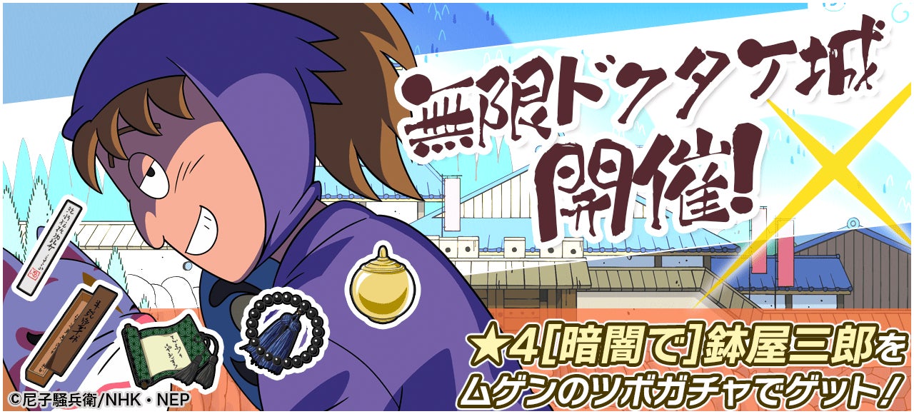 スマートフォンゲーム「忍たま乱太郎 ムゲンのツボ大暴走の段」(以下、『忍ツボ』)は2024年11月1日(金)より[小さな用具委員会]山村喜三太が登場するガチャおよび、[暗闇で]鉢屋三郎復刻イベントを開催いたします。