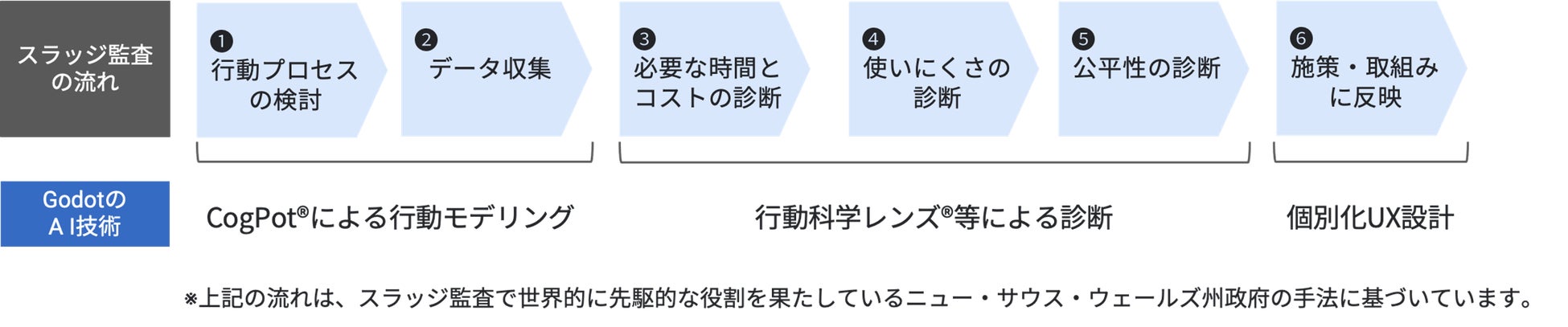 Godotは、この分野で先駆的な取組を行っているオーストラリアのニュー・サウス・ウェールズ州や、スラッジ監査の提唱者であるキャス・R・サンスティーン教授(ハーバード大学)が提唱する概念や手法に依拠しながら、独自のAI技術を活用することで、科学的根拠に基づく客観的な診断と改善をスピーディに実現していきます。