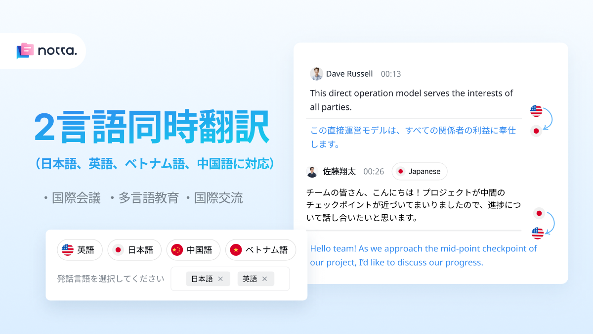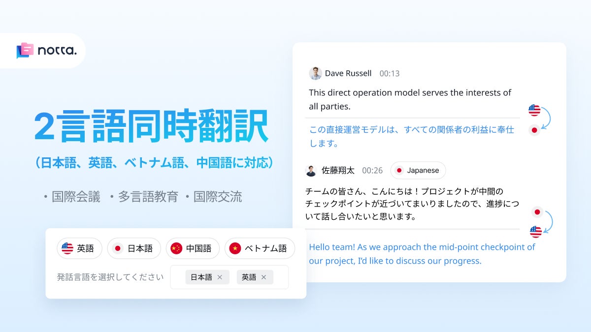 国際会議や多言語教育、グローバルコミュニケーションに最適!Nottaから画期的な「二言語同時翻訳」新機能が登場!