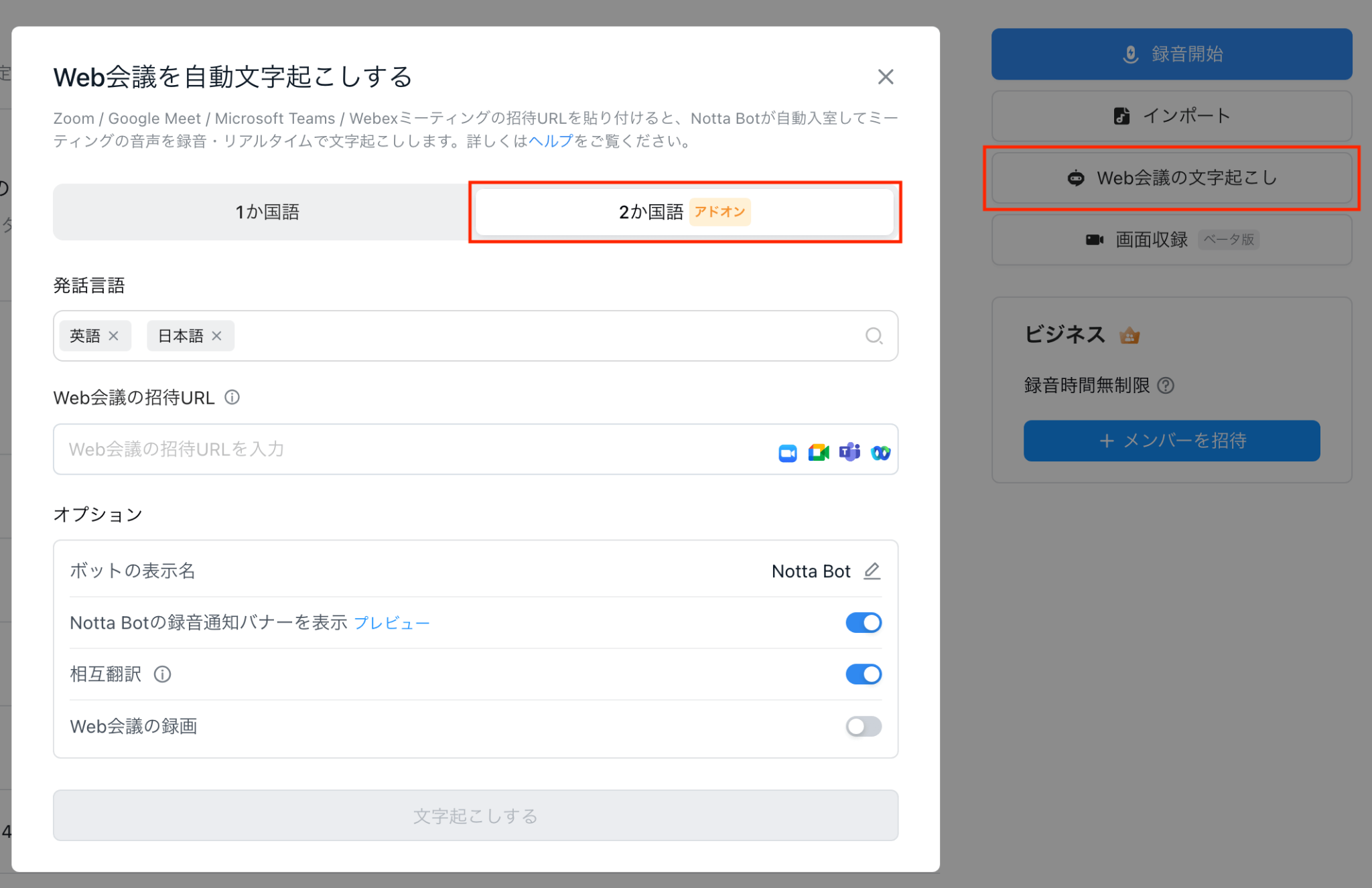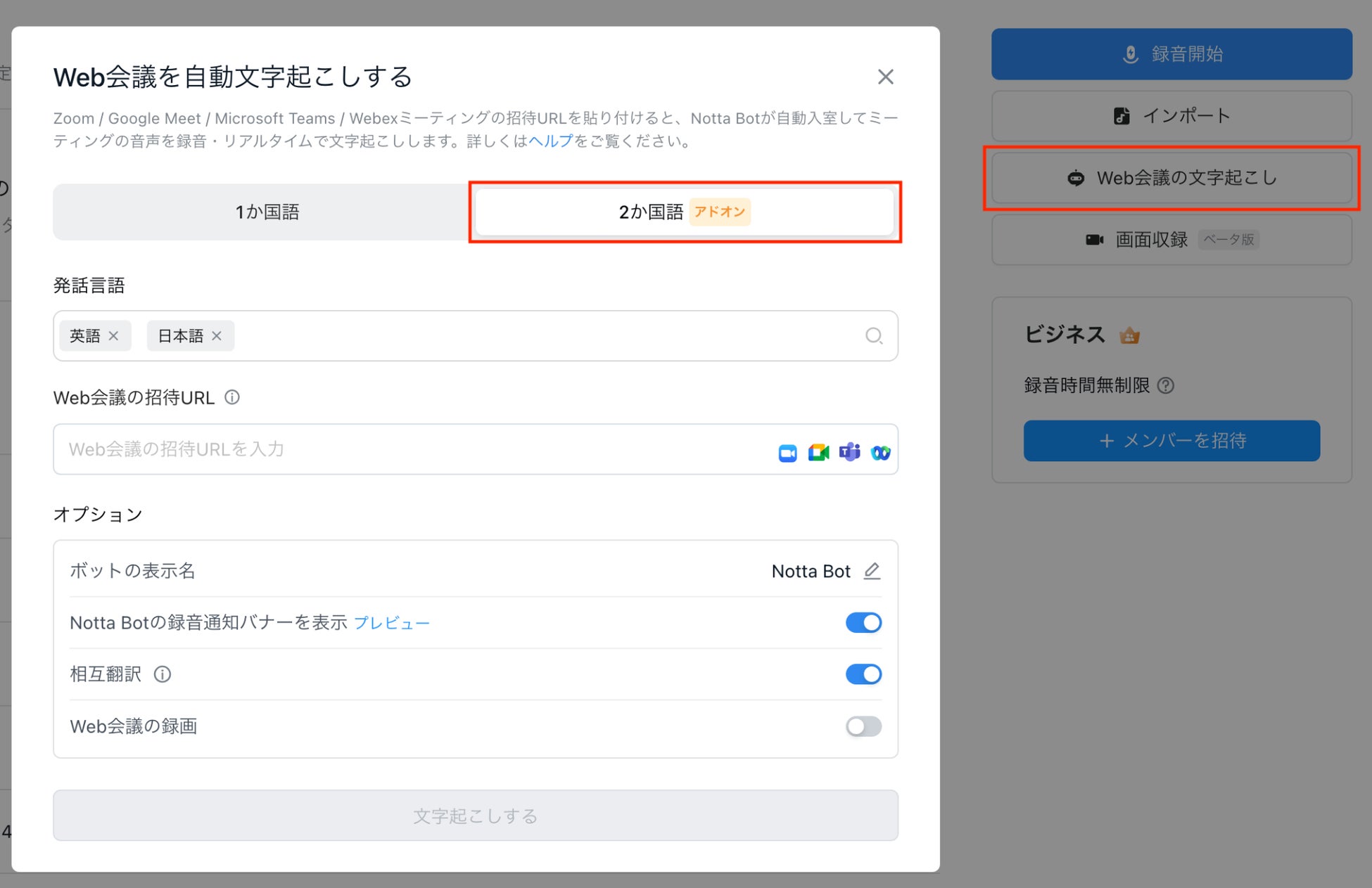 方法2:Notta Botによる2か国語文字起こし・翻訳