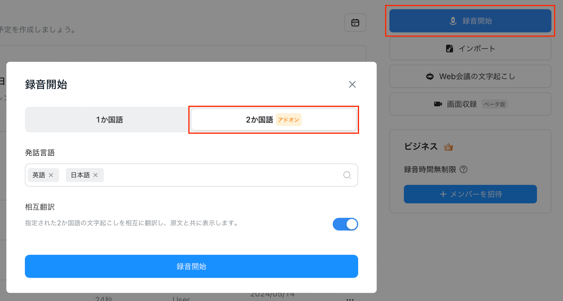 「録音開始」をクリックし、録音中は必要に応じて「相互翻訳」のオン/オフを切り替えることができます。