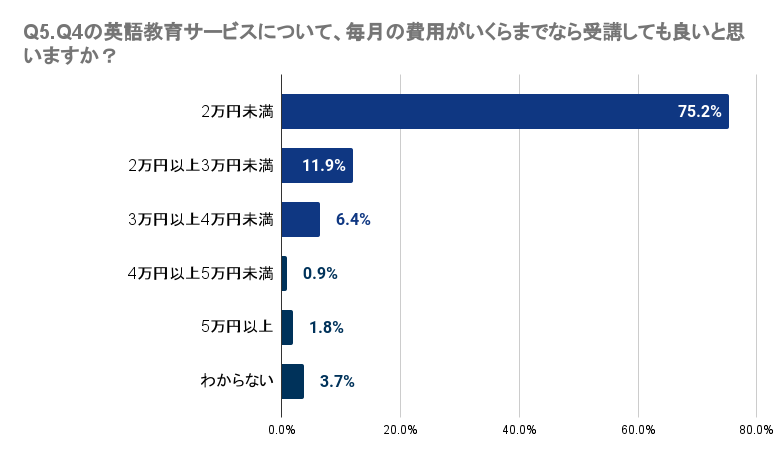 Q3・Q4では、「本物の英語力(英語4技能)を身につける事ができるケンブリッジプログラム」について、約80%の人が興味があるまたは受講したいと回答し、サービス内容では国際基準の英語力の養成や個別のニーズに応じた指導に興味があることが分かりました。さらに、Q5では87.2%の人が3万円未満の金額で受講したいと考えていることが分かりました。