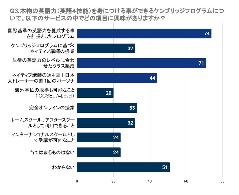 Q3で「本物の英語力(英語4技能)を身につける事ができるケンブリッジプログラムについて、以下のサービスの中でどの項目に興味がありますか?(複数回答可)」と質問したところ、岡山県で最も多かったのは「国際基準の英語力を養成する事を前提としたプログラム」で74名でした。次いで、「生徒の英語力のレベルに合わせたクラス編成」には71名、「ネイティブ講師の週4回+日本人トレーナーの週1回のパーソナルトレーニング」には44名が興味を持っています。一方で、「インターナショナルスクールとして受講が可能なこと」や「海外学位の取得も可能なこと(IGCSE、A-Level)」に関心を持つ人はやや少なめで、それぞれ24名、20名の回答でした。これらの結果から、多くの人は実用的な英語力の養成や個別のニーズに応じた指導に重きを置いていることが伺えます。