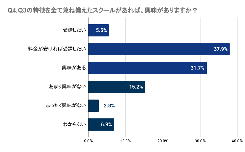 Q4で「Q3の特徴を全て兼ね備えたスクールがあれば、興味がありますか?」と質問したところ、岡山県では5.5%が受講を希望し、37.9%は料金が手頃であれば受講したいと考えています。さらに、31.7%は興味を示していると回答しました。多くの人がこのような特徴を持つスクールに一定の興味を示していることが分かります。