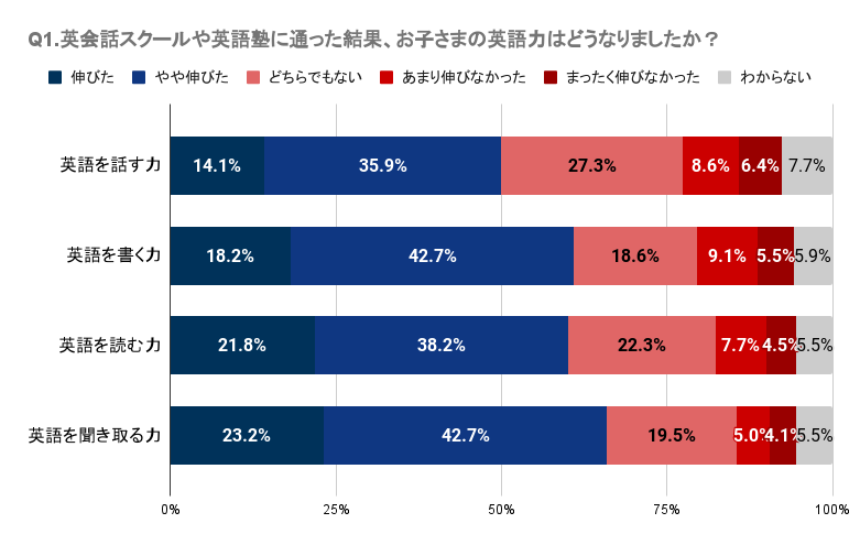 Q1で「英会話スクール、英語塾に通った結果、お子さまの英語力はどうなりましたか?」と質問したところ、岡山県では英会話スクールや塾に通って英語のスキル向上を明確に感じられなかったと感じている人が一定数いることが分かりました。具体的には、英語を話す、書く、読む、聞き取る各スキルにおいて、「伸びた」と感じる人は14.1%~23.2%であり、一方で「あまり伸びなかった」や「まったく伸びなかった」と回答した人が合わせて9.1%~15.0%となっています。特に、「英語を話す力」と「英語を書く力」においては「あまり伸びなかった」と「まったく伸びなかった」の合計がそれぞれ15.0%、14.5%となっています。また、各スキルに関して「どちらでもない」と答えた人も含めると、28.6%~42.3%となっており、明確な効果を実感していない人が一定数存在することが伺えます。