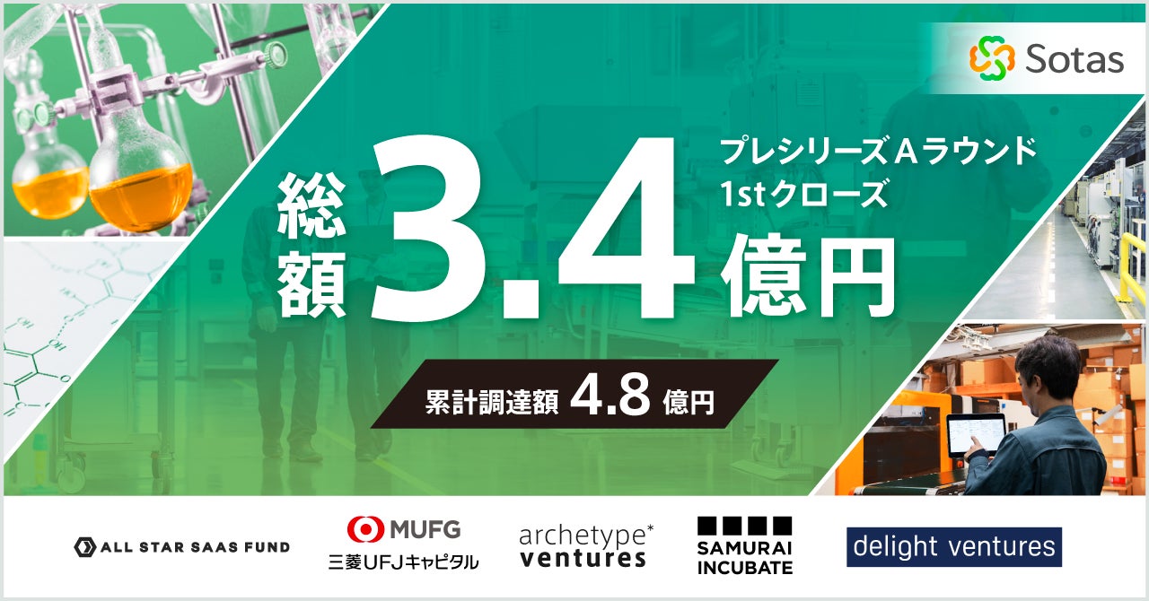 化学バーティカルSaaS企業Sotas プレシリーズAラウンド1stクローズで総額3.4億円の資金調達を実施