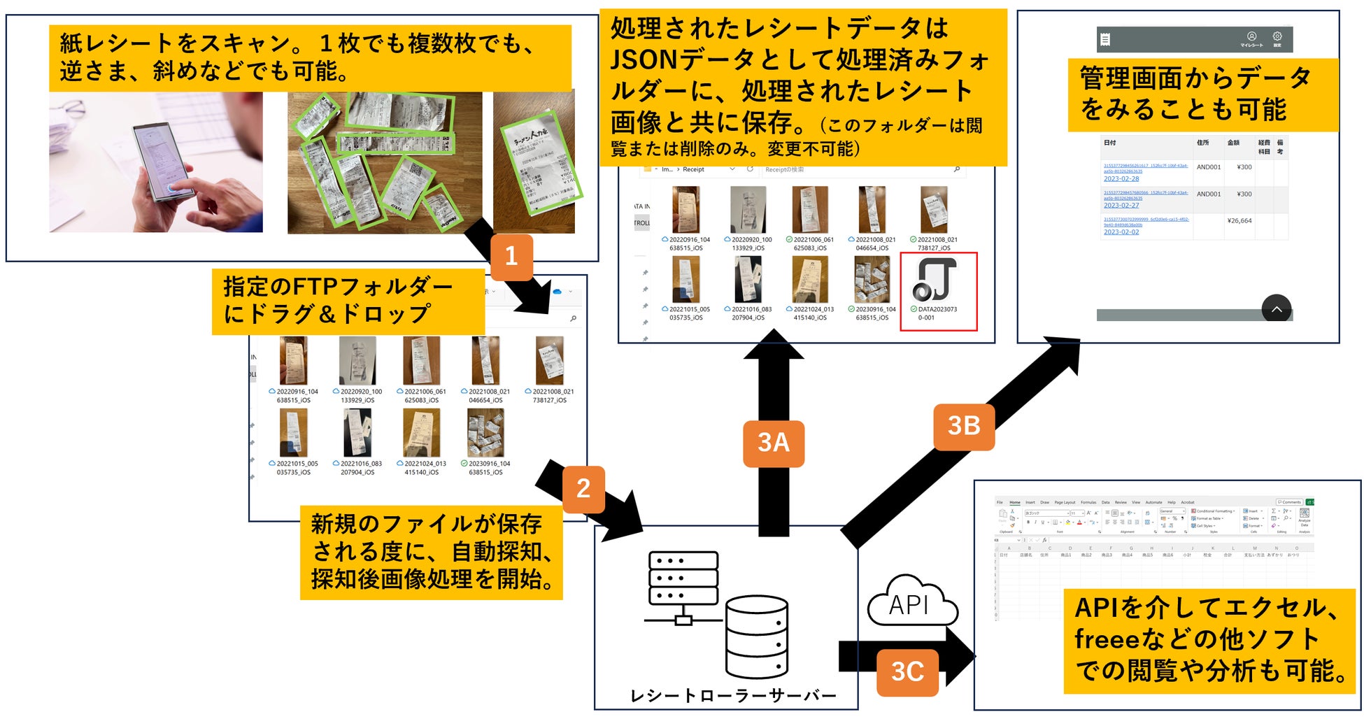 この新機能を利用することで、経費処理や家計簿データの連携などの煩雑な作業を一括で行うことが可能となります。ユーザー自身のコンピューターにFTPフォルダーを作成、そのフォルダーに保存されたレシート画像は自動的にOCR処理され、電子レシートデータとして保存されます。1枚の画像に複数枚のレシートデータが含まれている場合でも、一括処理されます。(10枚のレシートが1つの画像にある場合、10枚分のレシートデータが生成されます)。 保存先フォルダーごとに自動でラベリングが可能であるため、経費項目ごとにフォルダーあらかじめ分けておくなどで、レシートデータのグルーピングも可能となっています。