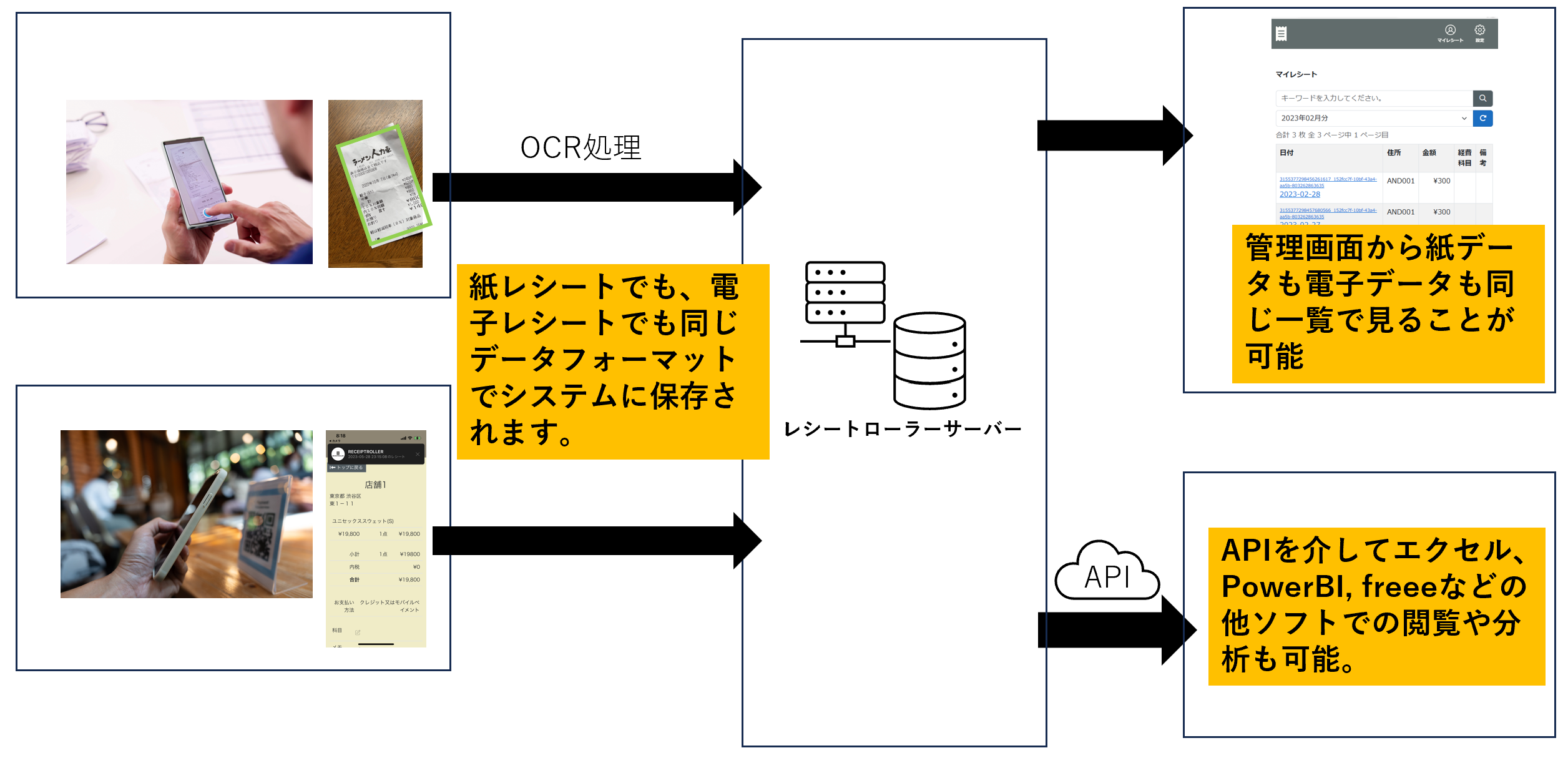 レシートローラーでは、紙で受け取ったレシートをスキャンしても、電子で受け取っても同じ台帳に保存されます。電子レシートがまだ普及していない現在でも、電子レシートが普及した時と同じようにデータ連携などをすることができます。