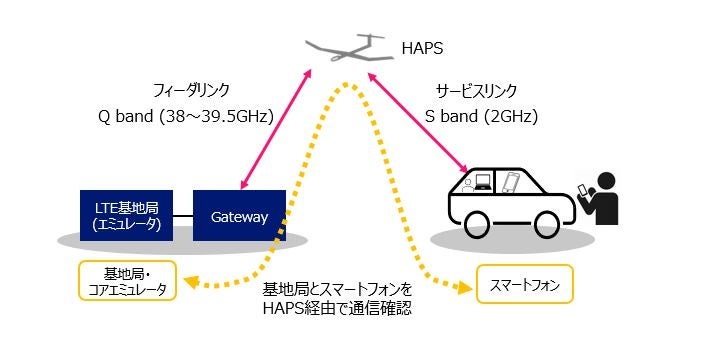 本実験では、地上のLTE基地局から送信される電波を高度約20kmの成層圏を飛行するHAPSを介し、地上のスマートフォンへ伝送する実証実験を実施しました。具体的には地上に設置したLTE基地局を地上ゲートウェイ局(※2)に接続し、HAPSに搭載した非再生中継方式(※3)と呼ばれる電波を折り返す中継技術を用いた通信装置を介して、地上のスマートフォンと情報データの送受信を行いました。その結果、地上ゲートウェイ局からHAPSを中継したスマートフォンへの通信(フォワードリンク)で4.66Mbps以上のスループットを確認しました。また、成層圏を旋回するHAPS機体から、一定のエリアに通信カバレッジを形成するために地上の定点にビームの中心を向ける技術を実装し、HAPSから折り返される電波がスマートフォンで正常に受信できることを地上の試験エリアにて確認しました。高度18km以上の成層圏を飛行する小型固定翼タイプのHAPS機体を用いて地上のスマートフォンと無線でのデータ通信を確立する事に成功したのは今回が世界初となります。
