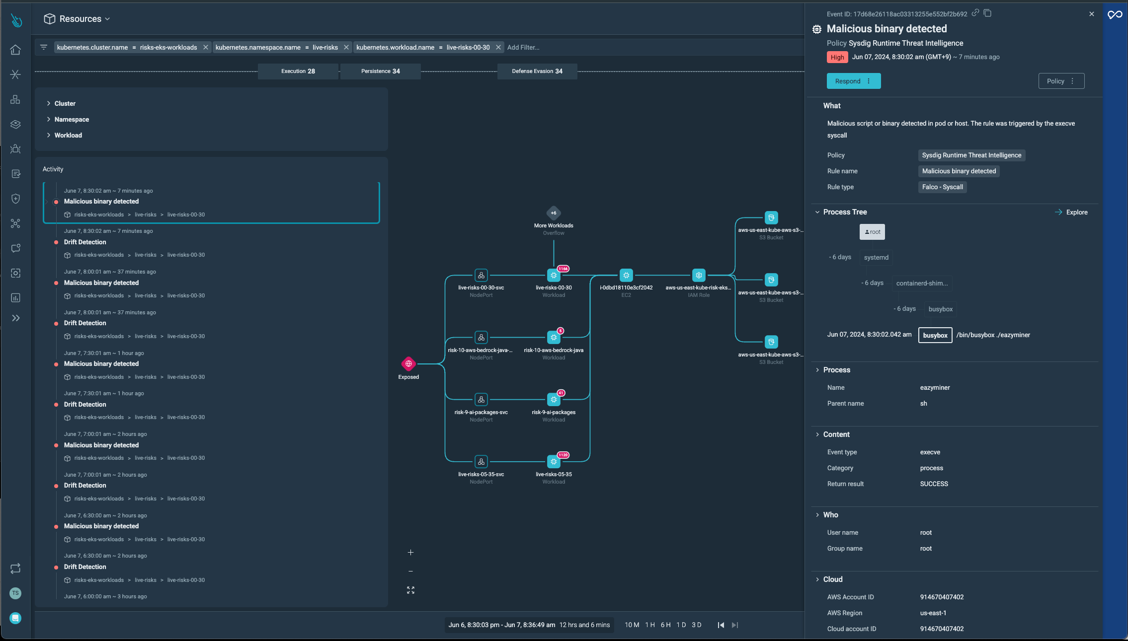 画像説明:悪意のあるバイナリがワークロード上で検知された場合に、当該ワークロードがどのEC2インスタンス上で動作しているか?そして、EC2インスタンスのIAMロールがS3バケットへのアクセス権限を有していることなどが相関表示されている