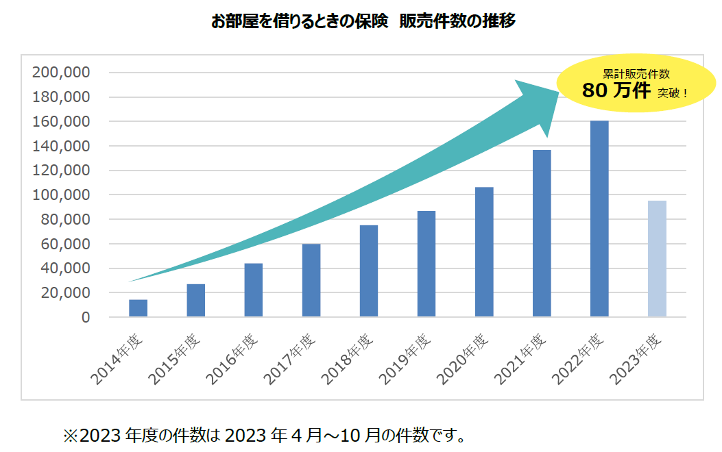 「お部屋を借りるときの保険」は、賃貸住宅に入居する際に必要な賠償責任や家財の補償等がセットされた保険です。賃貸住宅にお住まいの多くのお客さまにご支持いただいており、2014 年の発売以来、累計販売件数80万件※を突破しました。本商品の特長は、個人賠償責任1億円など充実した補償でありながら保険料がリーズナブルであること、契約のお申込みや住所変更といった諸手続きがネットで完結する利便性です。