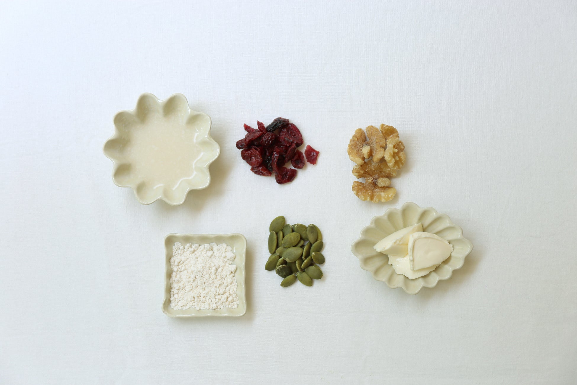 クリームチーズのミルク感のある風味を生かしながら(焼きすぎない)、グラノーラのカリカリの食感(しっかり焼く)の両方を実現できるように仕上げました。あえて、ナッツ類を少な目に調合し、クリーミーな風味も残しております。