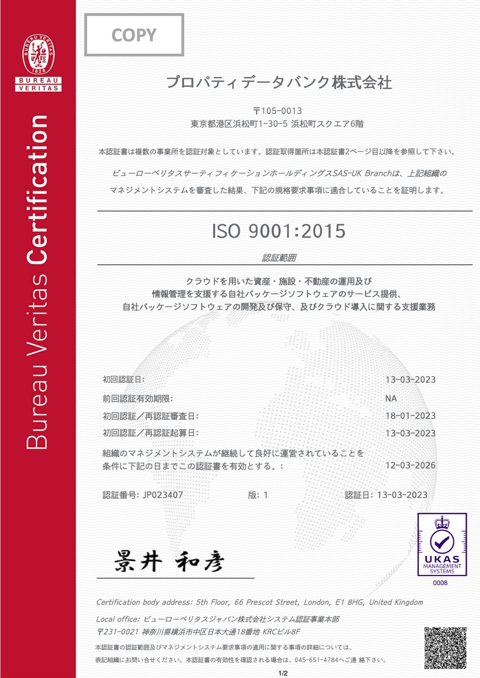 不動産管理クラウド「@property(@プロパティ)」を提供する、プロパティデータバンク株式会社(本社:東京都港区、代表取締役:武野貞久 以下、当社)は、2023年3月13日にクラウドを用いた資産・施設・不動産の運用及び情報管理を支援する自社パッケージソフトウェアのサービス提供、自社パッケージソフトウェアの開発及び保守、及びクラウド導入に関する支援業務について品質マネジメントシステムに関する国際規格「ISO9001:2015」を取得いたしましたことを報告いたします。