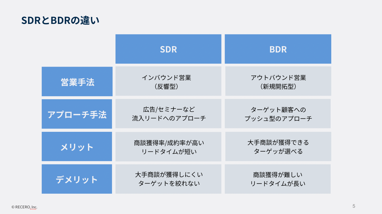 インサイドセールスには主に「SDR」(Sales Development Representative)と「BDR」(Business Development Representative)の2種類の手法があります。