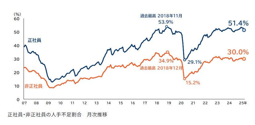 2025年4月時点で正社員の人手不足を感じている企業の割合は51.4%、非正社員では30.0%となったことが、帝国データバンクの調査によって明らかになっています。