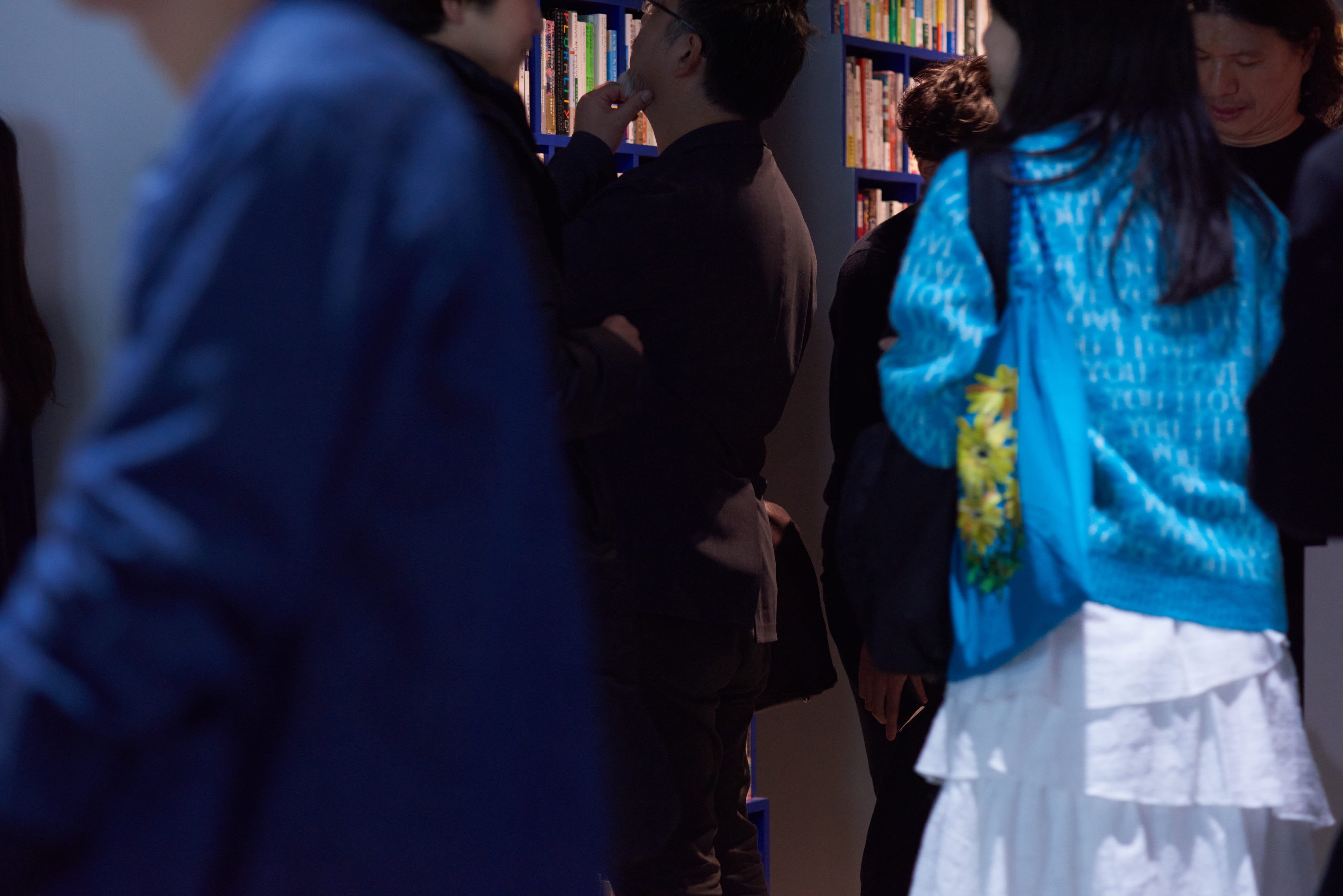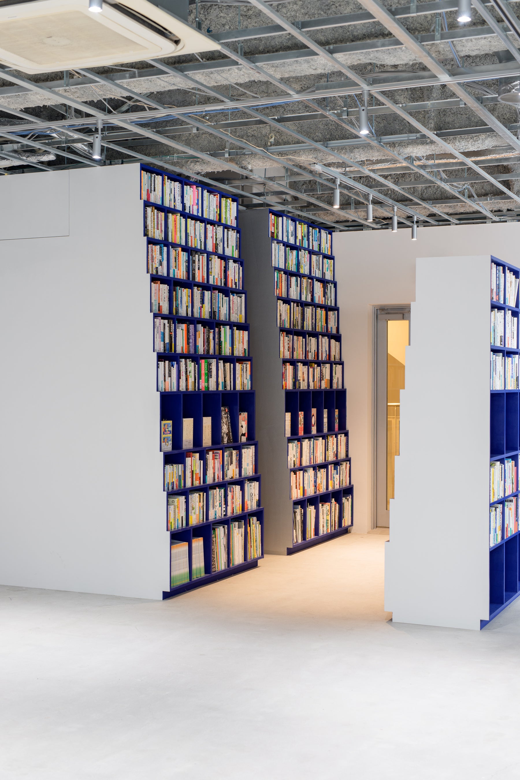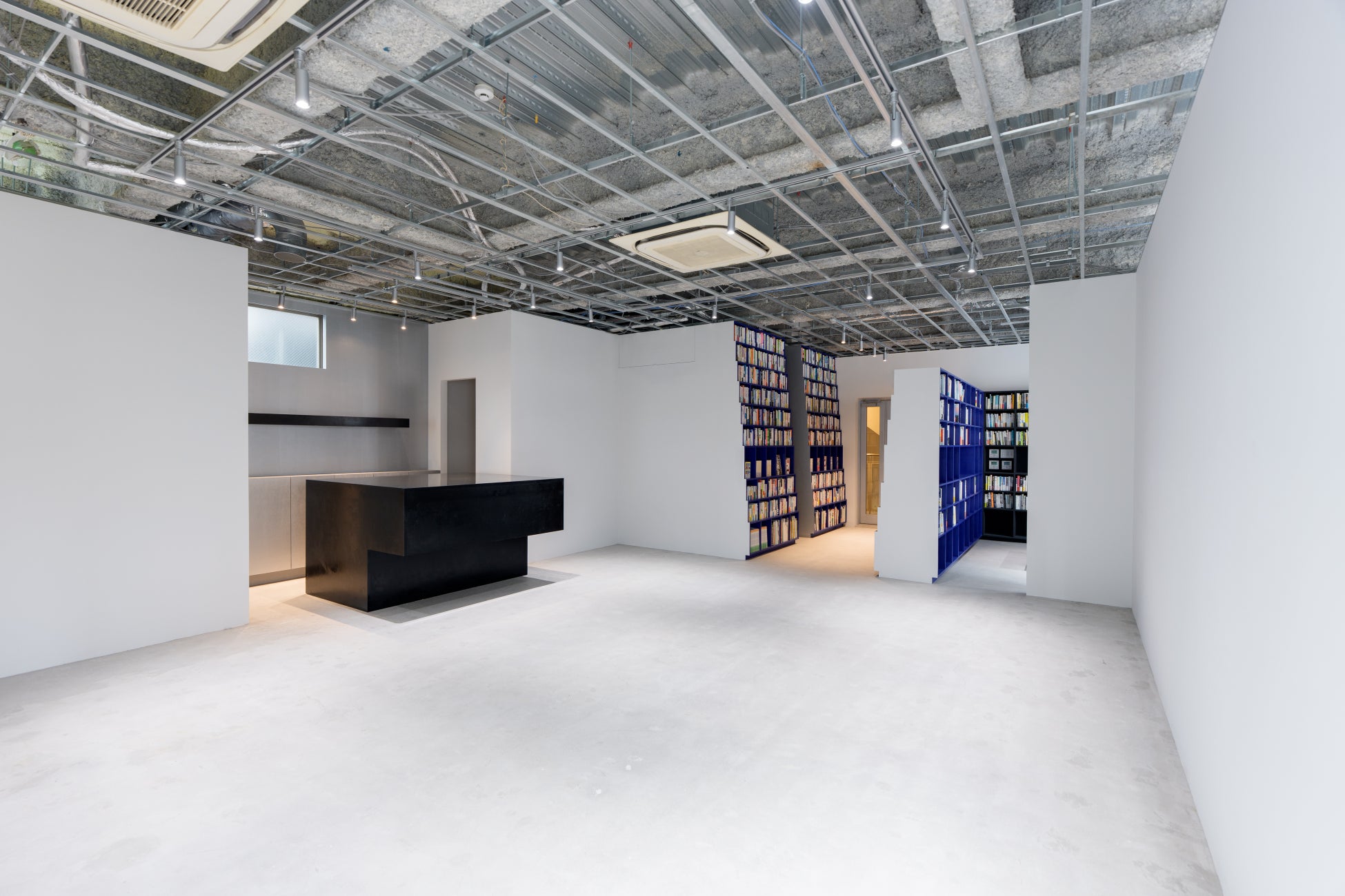 ここは小さな1室でありながら、イベントスペースであり、ギャラリーであり、バーであり、オフィスであり、図書館でもある。「未知の未知」という、名前からして謎めいているスペースにふさわしい形はどんなものかを考えるところから、このプロジェクトは始まりました。空間を特徴づけるのは、その大部分を占める中央の空白と、間の空間に差し込まれた本棚です。