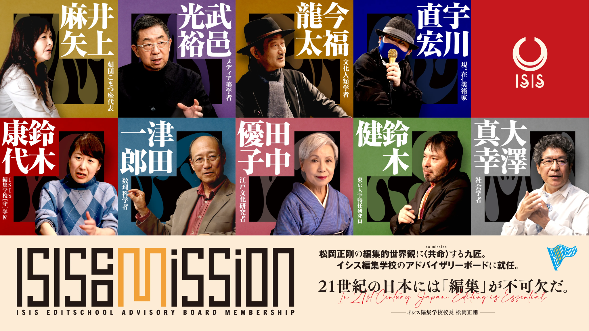 2026年3月27日に開催されたISIS co-mission会議では、各分野で活動する9人の文化人・有識者が一堂に会し、編集学校の現在とこれからについて意見を交わした。以下には、メンバー一人ひとりのプロフィール要約とともに、イシス編集学校へのエンドース・コメントを紹介する。