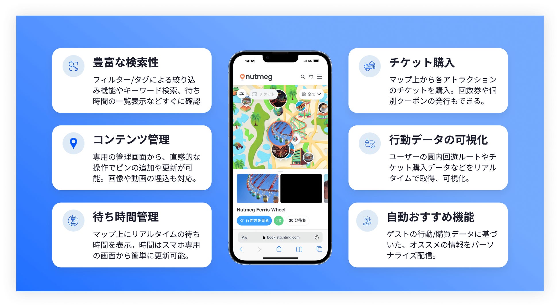 Nutmegの「スマートマップ」は、GoogleマップやGPSと連携し、現在地から目的地のルート案内、施設内の待ち時間情報、カテゴリやフィルター機能による情報の絞り込みが可能なデジタルマップ機能です。また、クーポンの配布やスタンプラリーの実施、デジタルマップ上でのチケットや体験の追加購入も簡単に行えます。