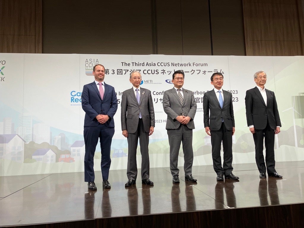 開会および閉会セッションの登壇者が一堂に(左から);アメリカ合衆国 エネルギー省 化石エネルギー・炭素管理局 Noah DEICH次官補、NEDO斎藤保理事長、経済産業省 吉田宣弘経済産業大臣政務官、東アジア・アセアン経済研究センター 渡辺哲也事務総長、CRF 満岡次郎会長