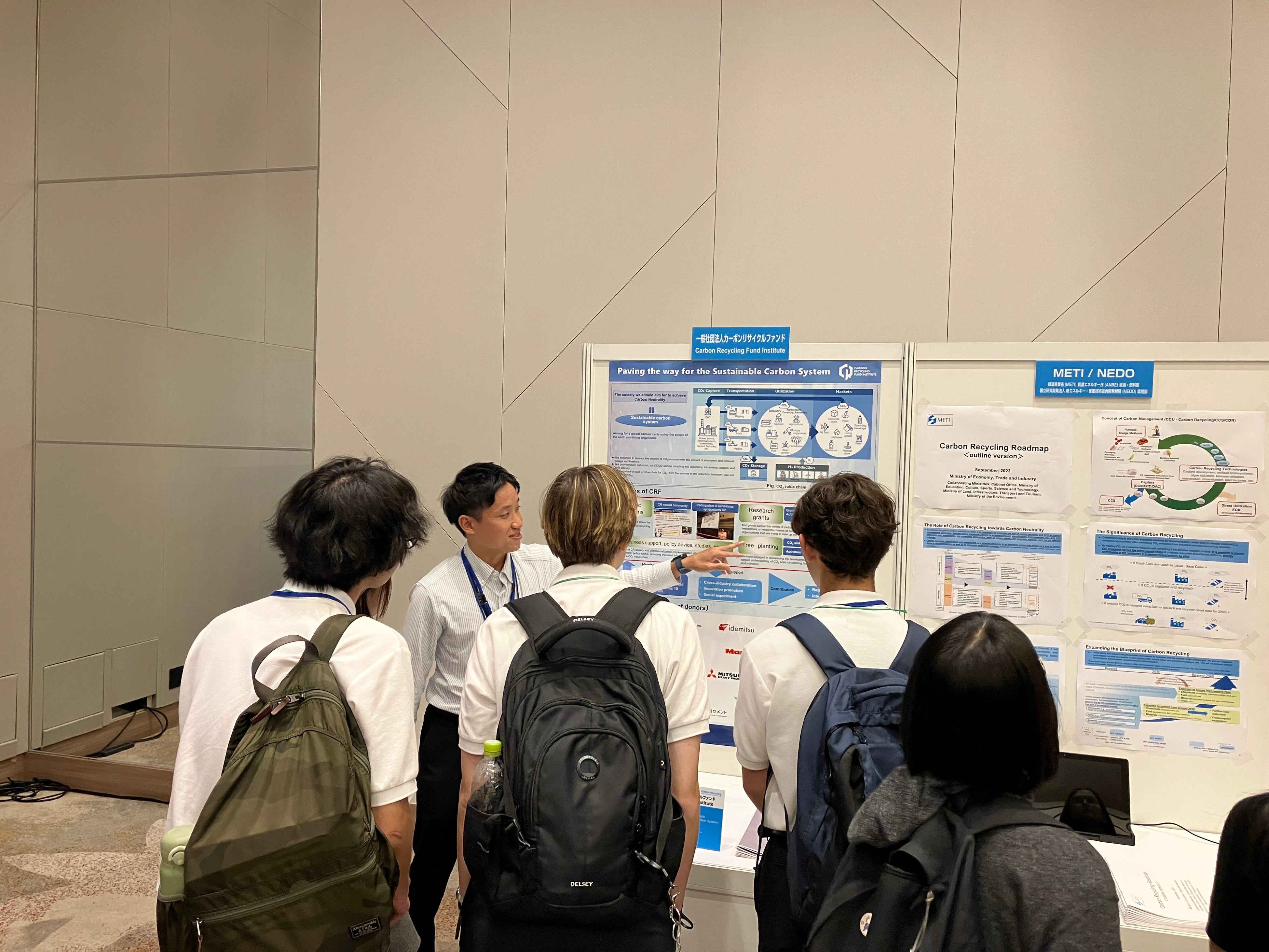 カーボンリサイクルに係る最新技術や取組を対面で紹介するポスターセッションには、CRFから21社*が出展。来場者及び展示者間でも活発な議論・情報交換がなされ、新しい協業につながる場となった。また、カーボンリサイクル担い手育成の一環として、広島大学生や県内高校生が国際会議参加、熱心な質疑応答のようすが随所に見られた。