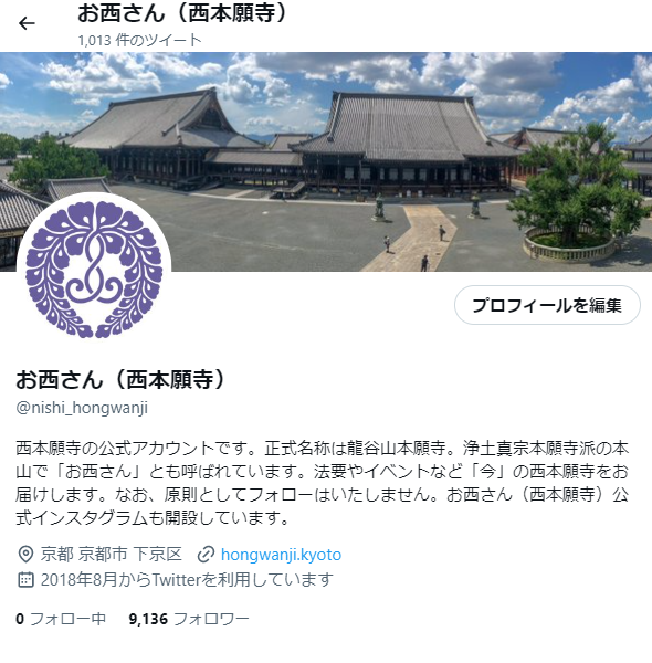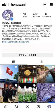 本願寺では、公式ツイッター<お西さん(西本願寺)ツイッター:フォロワー約1万人>、公式YouTubeチャンネル<お西さんの常例布教:登録者約3,000人・お西さんの法要行事:登録者約1,700人>と、SNSでの情報を積極的に発信しています。 2023(令和5)年2月には、新たに本願寺公式インスタグラム<お西さん(西本願寺)インスタグラム>を開設し、本願寺の四季折々の風景などをお届けしています。開設から3ヵ月が経ち、フォロワーは400名を超えました。