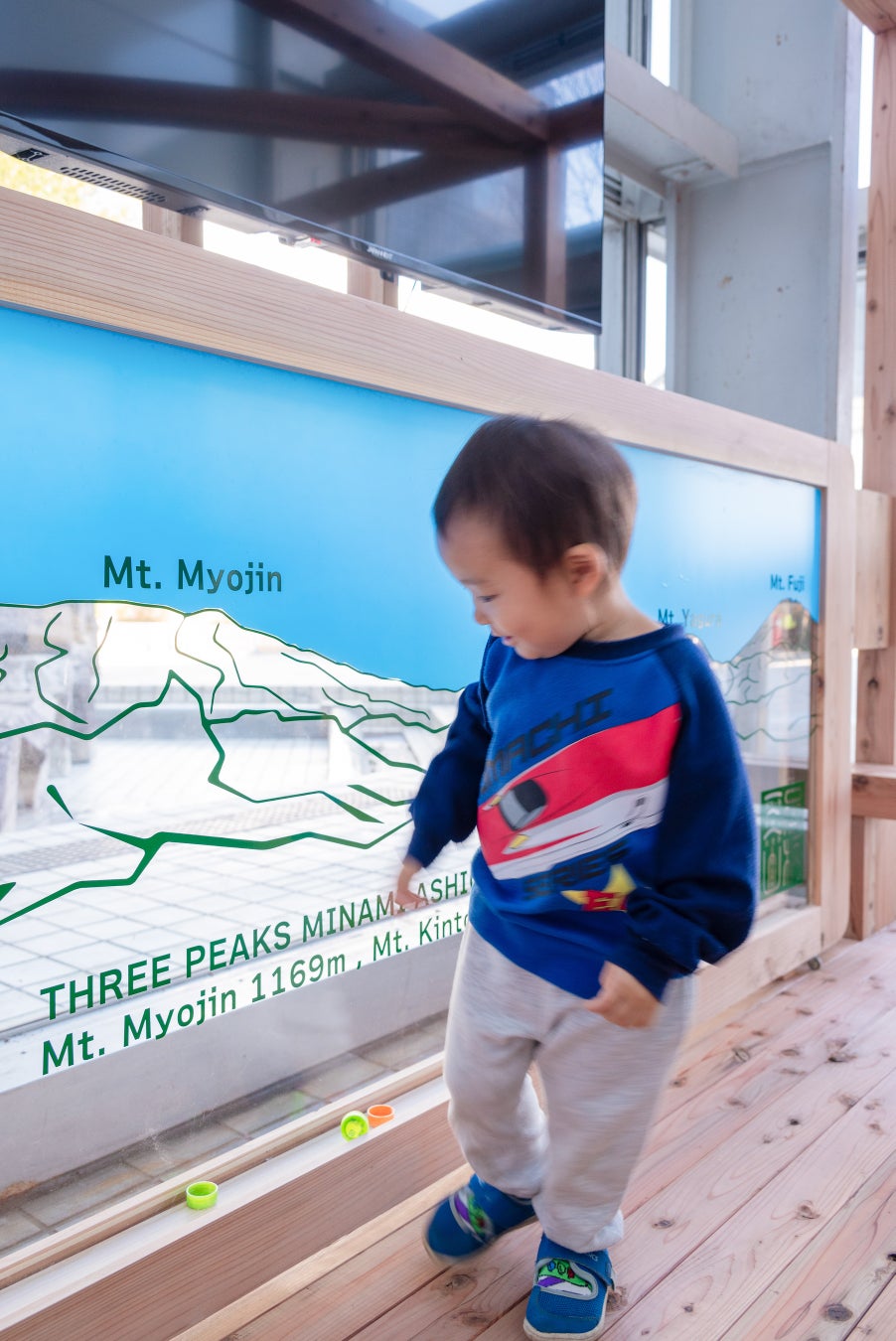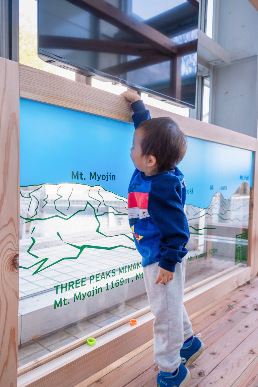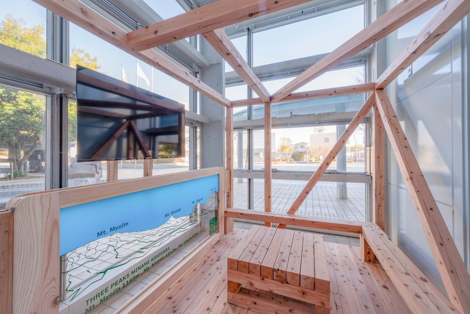 足柄三山(明神ヶ岳、金時山、矢倉岳)をモチーフにしたペットボトルキャップの回収BOXと、南足柄市や事業者のカーボンニュートラル実現に向けた取り組みをお知らせするためのモニターが設置されています。