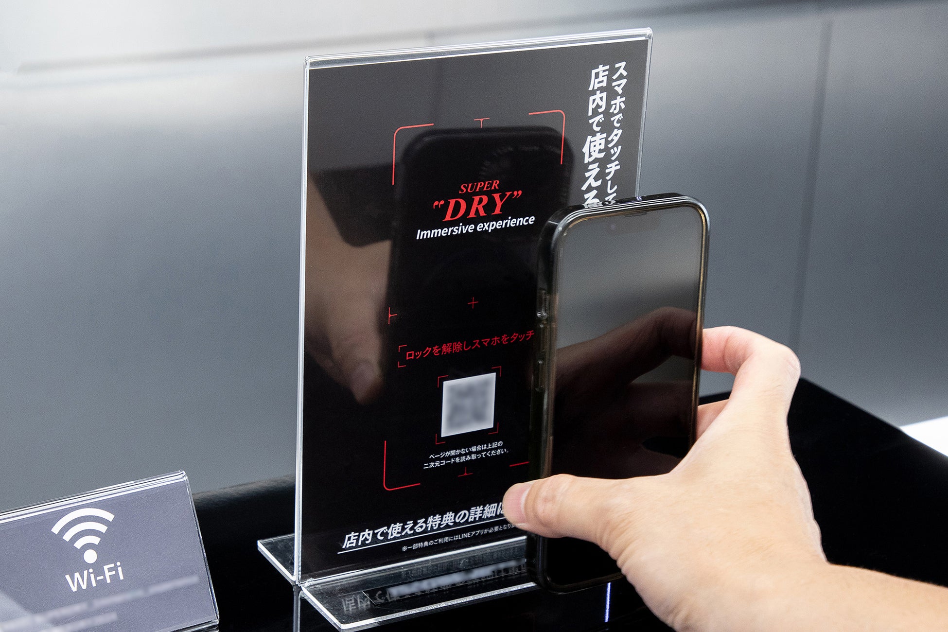 スマートフォンよりも一回り大きい「MEET EASY ACCESS」(特許出願済 ※2)を活用いただいており、卓上POPにスマートフォンをタッチするだけでブラウザが立ち上がり、申込みページが表示されます。二次元バーコードのようにカメラや読み取りアプリを開く必要がないほか、「SUPER DRY Immersive experience」の名の通り、スーパードライらしい体験を演出しております。