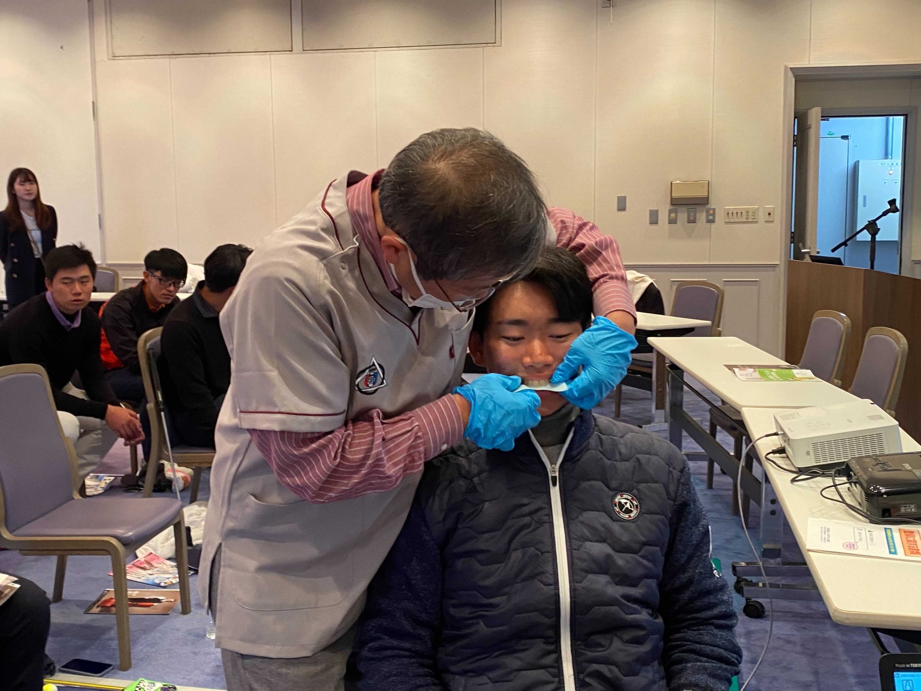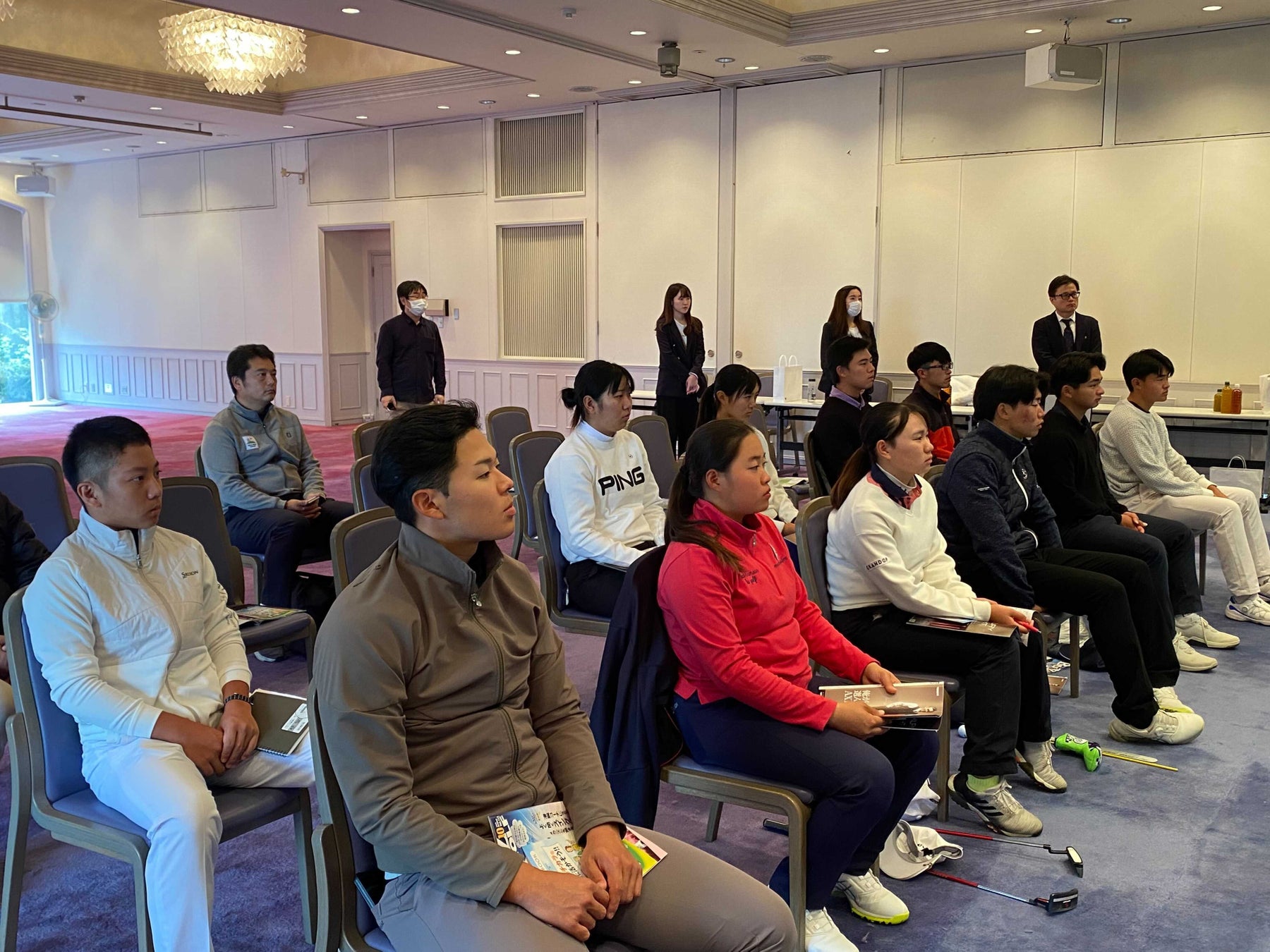 武田客員教授による口腔健康セミナーを実施。「噛むこと」が、運動能力や怪我の防止に良い効果があること、食事をよく噛んで食べることのメリットなどの講義が行われました。武田客員教授より「様々な判断や“考えること”が試されるゴルフにおいて、噛むことが非常に重要です。ガムを噛むことにより、脳の前部分(前頭前野)が活性化され、記憶力・認知機能の向上に繋がります。強く噛みしめるほど運動に関連する脳の部位が活性化し、筋活動の増強が期待されます」といったお話があり、アカデミー生たちは皆、真剣な表情で武田客員教授の講義に耳を傾けていました。