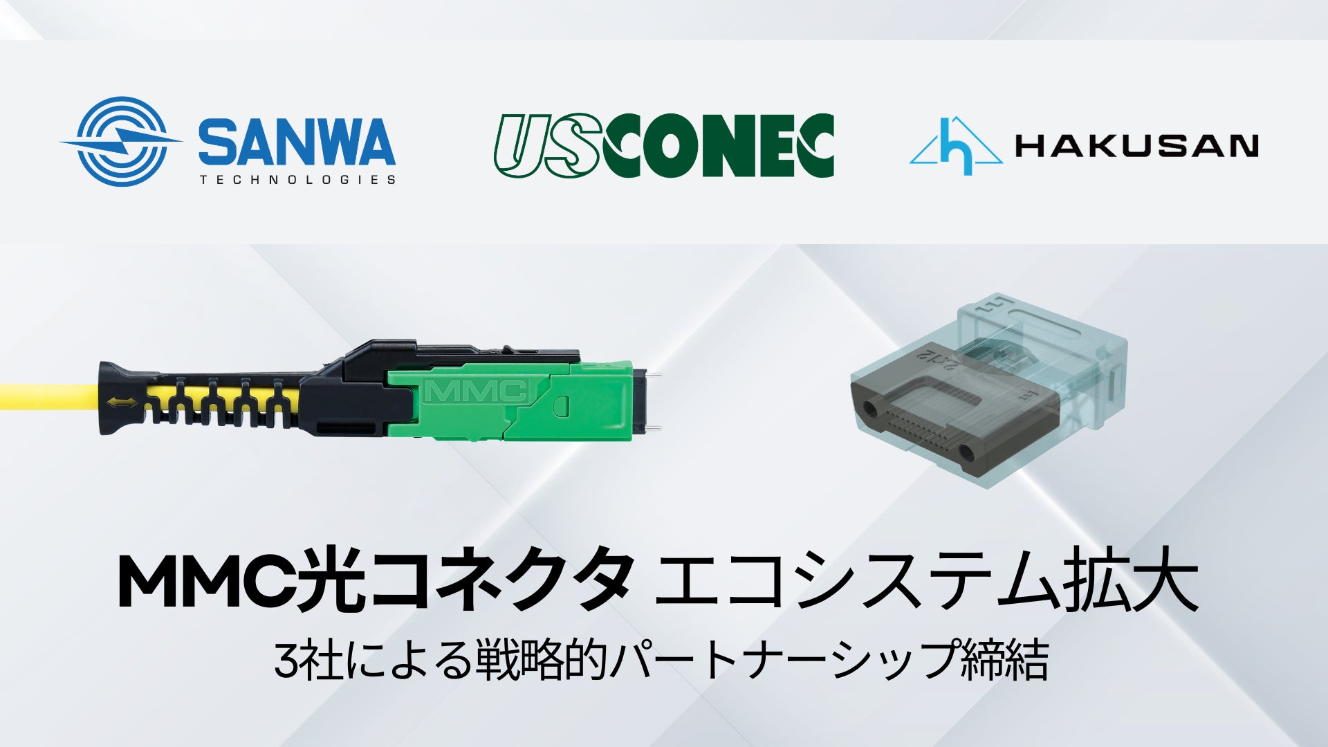 SANWA Technologies, Inc. (Chairman & CEO:石井保雄、以下「SANWA Technologies」) 、株式会社白山(代表取締役社長:米川達也、以下「白山」) 、および米国US Conec Ltd.(President:Joe Graham、以下「US Conec」)は、このたび、超小型フォームファクタ(Very Small Form Factor、以下「VSFF」)であるMMC多心光コネクタ(以下、「MMC光コネクタ」)およびTMTフェルール部品のマルチソース化ならびに開発に関する契約を締結したことを発表いたします。