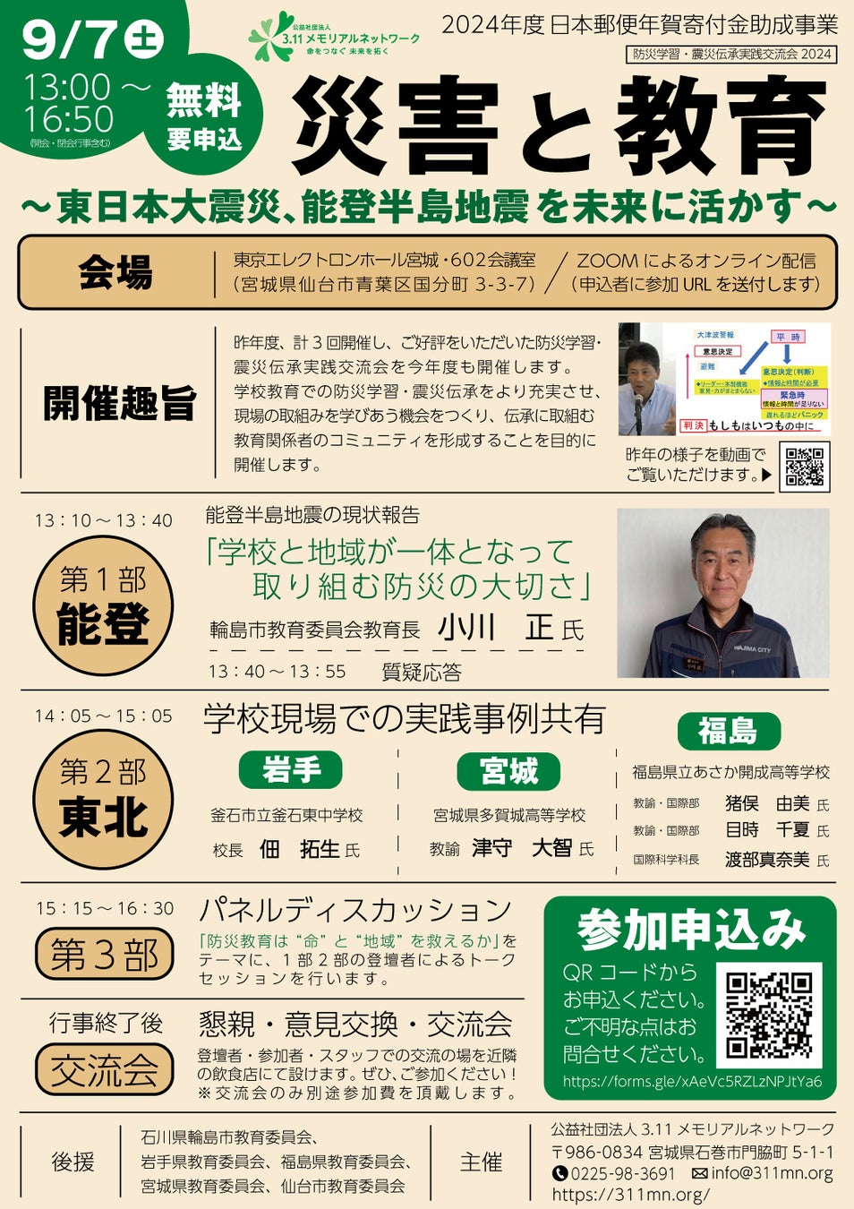 3.11メモリアルネットワークでは、今年度も、主に教員の方を対象に防災学習・震災伝承実践交流会「災害と教育~能登半島地震、東日本大震災を未来に活かす~」を開催します。